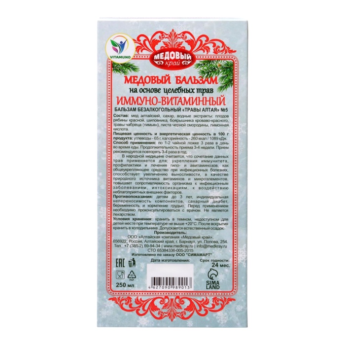 Габариты: 18 x 8,3 x 4 Страна: Россия В боксе: 14 шт Состав: См. на упаковке Материалы: см. на упаковке Фасовка: по 1 шт Индивидуальная упаковка: Цветная картонная коробка Сертификат: ЕАС Набор: Нет Срок годности, мес: 24 Вес, г/Объём, мл: 250 Объём, мл: 250 Тематика праздника: Новый год Вкус: Мёд Назначение: Для иммунной системы Форма выпуска: Бальзам Показания: Укрепление иммунитета Компоненты: Боярышник, Тимьян, Рябина, Шиповник Действие: Общеукрепляющее Медовые бальзамы – натуральный продукт, изготовленный для людей, которые бережно относятся к здоровью. Для производства бальзамов на меду мы используем натуральный Алтайский мед, лекарственные травы, плоды, коренья, собранные в экологически чистых районах горного Алтая. Благодаря строгому соблюдению технологии производства и использованию только натуральных компонентов мы получаем продукт высочайшего качества. Бальзамы на меду имеют мягкий, неповторимый вкус и приятный аромат. Сбалансированный и тщательно продуманный состав бальзамов обладает целенаправленным оздоровительным действием на организм. Комментарии к товару