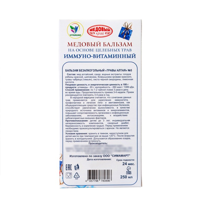 Габариты: 4 x 8,5 x 17,5 Страна: Россия В боксе: 14 шт Состав: См. на упаковке Материалы: см. на упаковке Фасовка: по 1 шт Индивидуальная упаковка: Цветная картонная коробка Сертификат: ЕАС Набор: Нет Вес, г/Объём, мл: 250 Объём, мл: 250 Тематика праздника: Новый год Вкус: Травы Возраст: Для взрослых Назначение: При простуде и гриппе, Для иммунной системы Форма выпуска: Бальзам Показания: Укрепление иммунитета Компоненты: Боярышник, Листья смородины, Тимьян, Рябина, Шиповник, Мёд Действие: Общеукрепляющее В составе бальзама: натуральный Алтайский мёд — рябина — шиповник — боярышник — чабрец (тимьян) — лист черной смородины. В народной медицине бальзам применяется в качестве природного источника витаминов и микроэлементов, как общеукрепляющее и поливитаминное средство при инфекционных болезнях, гипо- и авитаминозах, повышает защитные функции организма, укрепляет иммунитет. Способ применения: по 1-2 чайной ложке 3 раза в день во время еды. Продолжительность приема 3-4 недели. Прием рекомендуется повторять 3-4 раза в год. Противопоказания: детям до 3 лет, индивидуальная непереносимость компонентов, сахарный диабет, беременность и кормление грудью. Перед применением необходимо проконсультироваться с врачом. Не является лекарством. Срок годности: 24 месяца Комментарии к товару