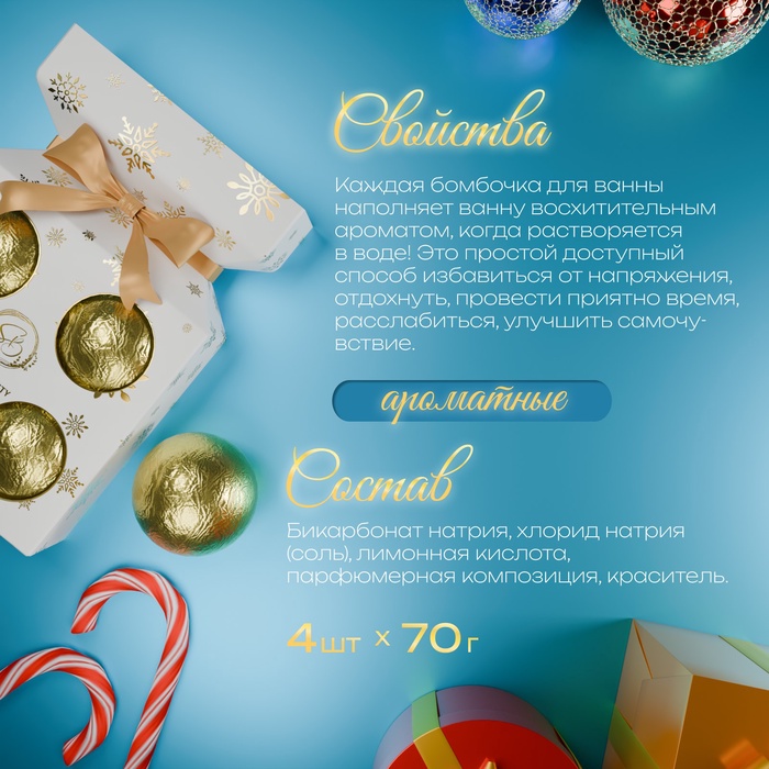 Габариты: 5 x 10 x 12,5 Страна: Китай В боксе: 24 набор Фасовка: по 1 набор Индивидуальная упаковка: Цветная картонная коробка Сертификат: ЕАС Набор: Да Цвет: Белый Для кого: Унисекс Форма: Шар В наборе, шт.: 4 Вес, г/Объём, мл: 70, 280 Вес, г: 70 Тематика: Рождественская, Новогодняя Вид упаковки: Картонная упаковка Символ года: Нет Тематика праздника: Новый год, Рождество Адресат: Без адресата Аромат: Имбирное печенье, Мандарин, Хвоя, Корица Составляющие набора: Бомбочка для ванн Темпер. ограничение НЕ НИЖЕ ℃: 0 Возраст: Для детей, Для взрослых Назначение: Успокаивающая Особенности: Без особенностей Фиксированная цена: Да Каждая бомбочка для ванны в этом прекрасном наборе наполняет ванну восхитительным ароматом, при растворении в воде! Это простой и доступный способ избавиться от напряжения, отдохнуть, провести приятно время, расслабиться, улучшить самочувствие. Наслаждайтесь расслабляющими моментами ванной с бомбочкой, ощущая ее благотворное воздействие на вашу кожу, с ароматами нового года, чтобы создать неповторимый опыт для ваших чувств. Наполнение набора: