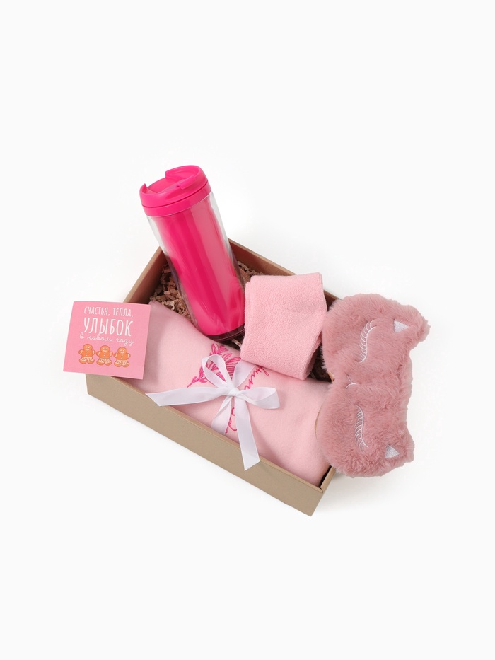 Этот комплект помогает создать атмосферу тепла и расслабления в зимние дни. Плед и аксессуары поддерживают комфорт во время отдыха и сна, а нежный розовый оттенок и аккуратная вышивка добавляют праздничный акцент. Такой подарок подойдёт для близких женщин — жены, мамы, бабушки, сестры или коллеги, показывая внимание и заботу в новогодний период.