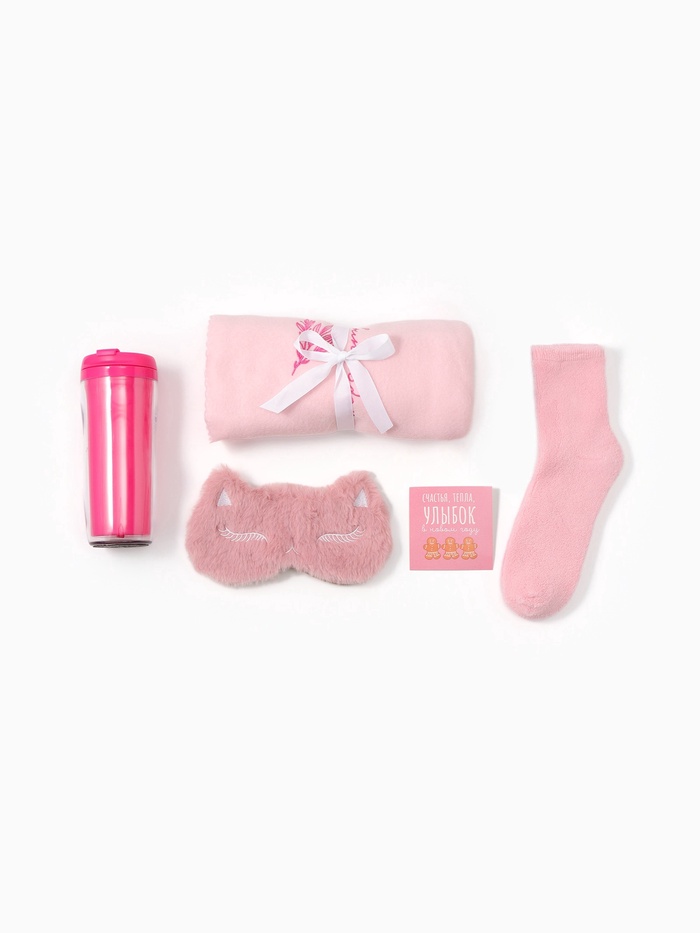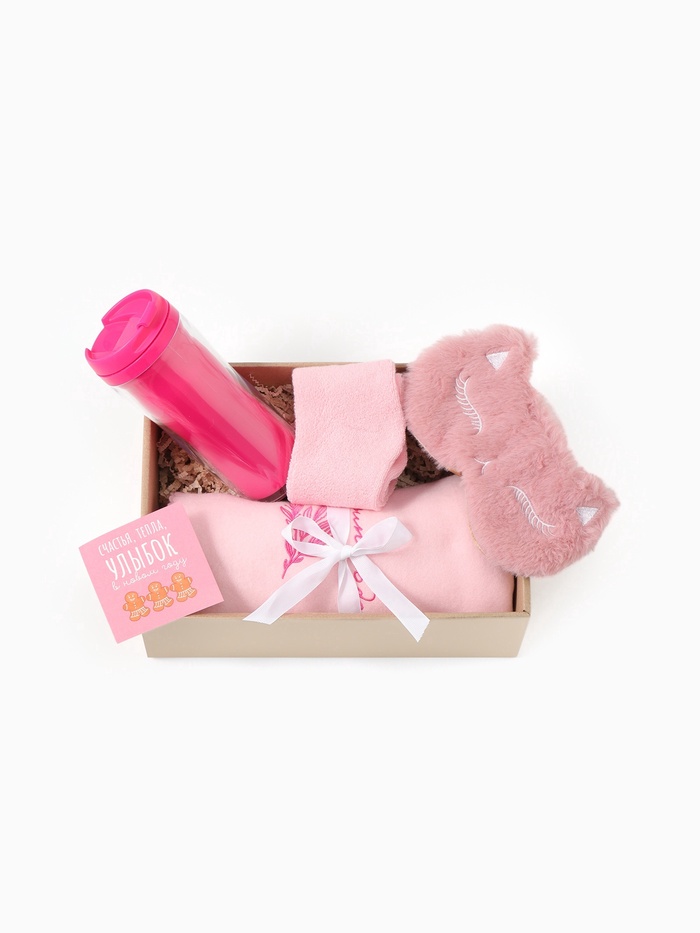 Составляющие набора: Открытка, Плед, Маска для сна, Носки