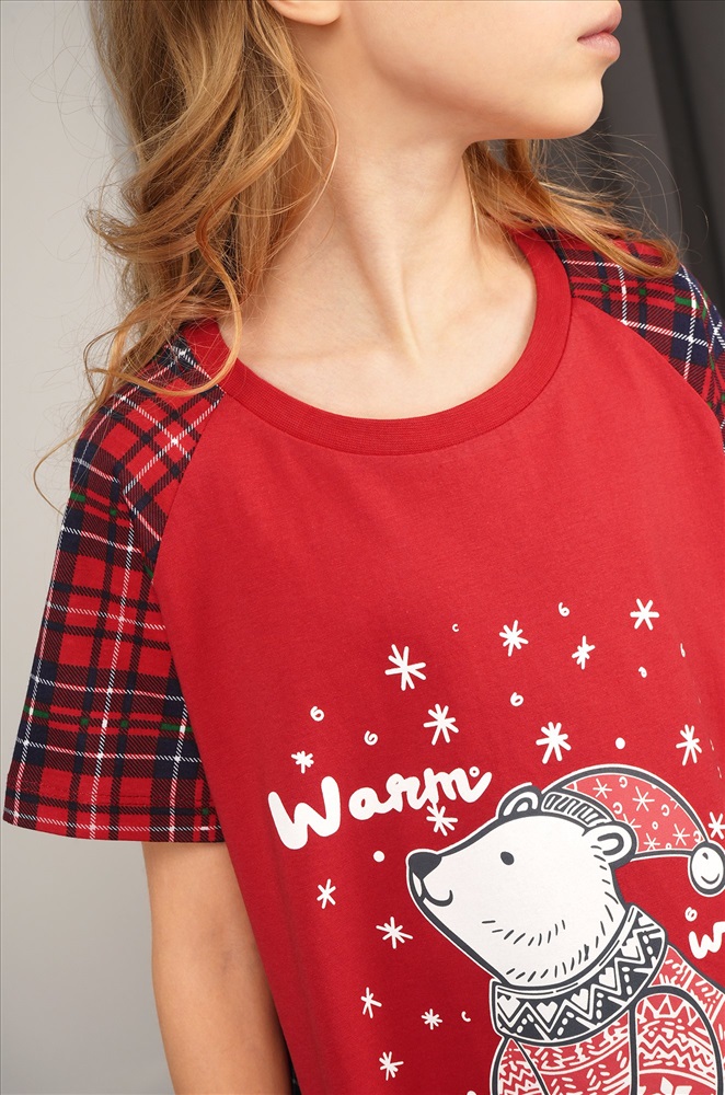 — красная сорочка с короткими рукавами смотрится нарядно и празднично, создавая атмосферу Нового года и Рождества;