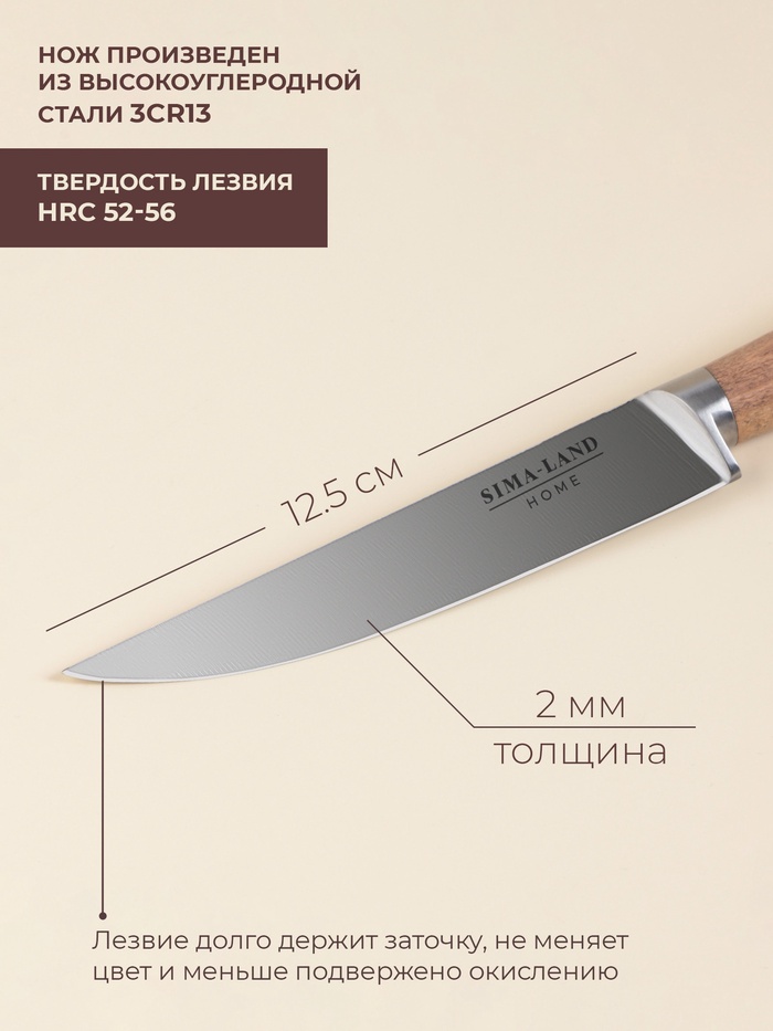 Габариты: 27 x 5,5 x 2,5 Страна: Китай В боксе: 72 шт Состав: Дерево, коррозионностойкая сталь Материалы: дерево, Коррозионностойкая сталь Фасовка: по 1 шт Индивидуальная упаковка: Картонная коробка Сертификат: СТР Цвет: Бежевый Длина лезвия, см: 12,5 Материал ручки: Дерево Рисунок: Нет Тип покрытия: Без покрытия Материал лезвия: Нержавеющая сталь Тип ножа: Универсальный Фиксированная цена: Да ![]() ![]() Универсальный помощник на вашей кухне — нож «Калабрия»! Универсальный нож "Калабрия" — это сочетание превосходного качества, удобства и стильного дизайна, созданное для того, чтобы помочь вам легко справляться с любой задачей на кухне. Преимущества: