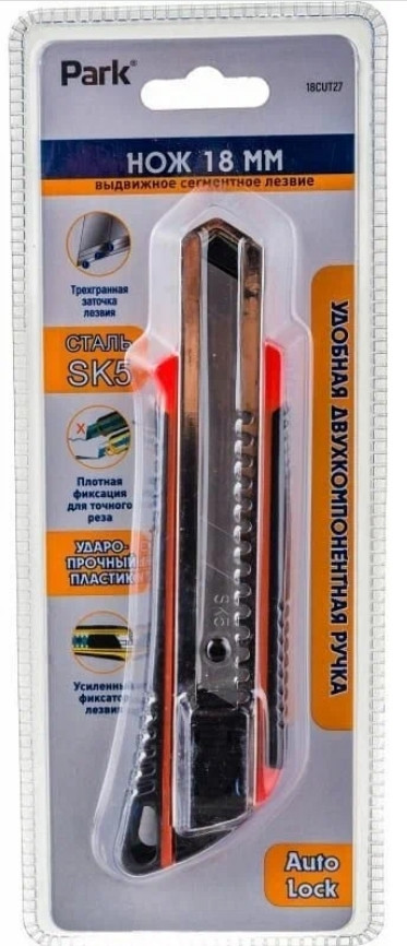 Нож Park 18мм, выдвижное сегментное лезвие, металлическая направляющая, 2-х компонентная ручка из АБС-пластмассы (ударопрочная) + термопластичная резина, углеродистая стальУпаковка - блистер.Материал изготовления - пластмасса, металл, ТПР