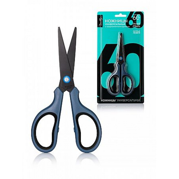 Ножницы с металлическими лезвиями. Ножницы универсальные используются как для творчества и рукоделия, так и как канцтовары для школы и офисных задач. Длина ножниц 165 мм. Длина лезвий 60 мм. Материал ручек: пластик. Материал лезвия: нержавеющая сталь.