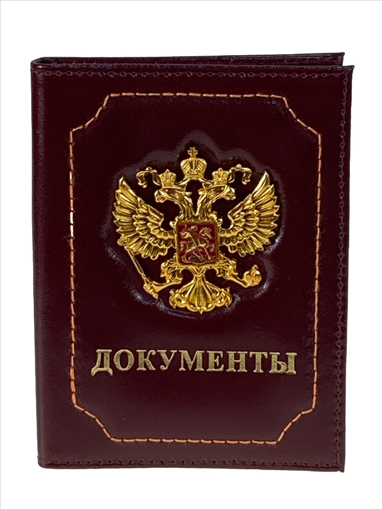 Обложка для документов из натуральной кожи. Фронтальная часть с надписью Документы. Внутри пластиковый файл для водительского удостоверения, 4 файла для СТС, сложенный файл формата A5, на левом развороте открытый карман с двумя отсеками для пластиковых карт.