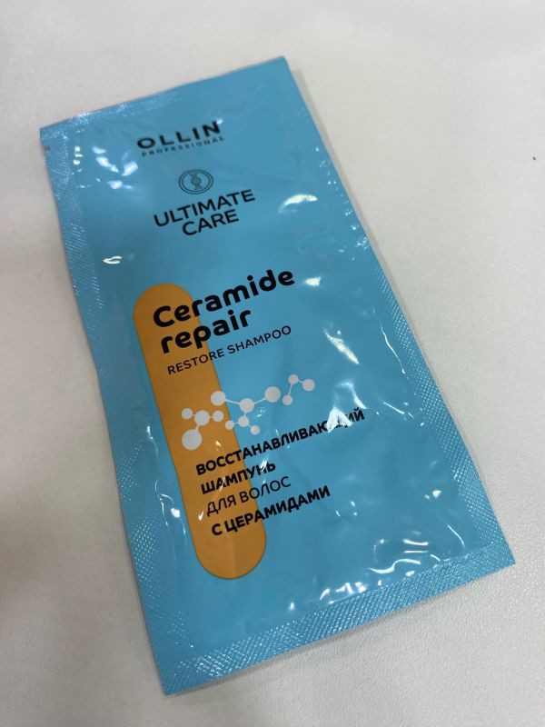 Ollin Ultimate Care Восстанавливающий шампунь с церамидами 10 мл. Активный комплекс Lustreplex™ защищает волосы от сечения, делает их гладкими и шелковистыми, убирает пушистость. Церамиды питают волосы по всей длине, придавая им тонус и ощутимую плотность. При регулярном использовании волосы становятся более крепкими, плотными и блестящими.
