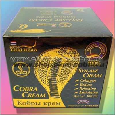Омолаживающий интенсивный крем для лица "Кобра" с эффектом ботокс Cobra cream 100ml Антивозрастной крем для лица «Кобра» с выраженными омолаживающим и разглаживающим морщинки действиями. Крем «Кобра» уникален тем, что содержит в составе пептид – миорелаксант под названием Syn-Ake, который сокращает мышечную активность и дает эффект, сходный с эффектом ботокса. Также в составе тайского крема Кобра с ботокс эффектом содержаться коллаген и гиалуроновая кислота – это активные компоненты для поддержания эластичности, упругости и молодости кожи. Крем Кобра рекомендуется для ухода за зрелой кожей лица и шеи - регулярное использование крема с эффектом ботокс не только значительно уменьшает существующие морщинки, но и препятствует возникновению новых. Объем крема для лица Кобра 100 мл Произведено в Таиланде. Комментарии к товару
