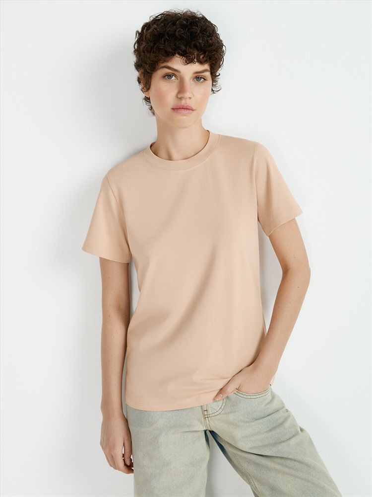 Женская футболка прилегающего силуэта с коротким рукавом, округлой горловиной и длиной чуть выше линии бёдер.