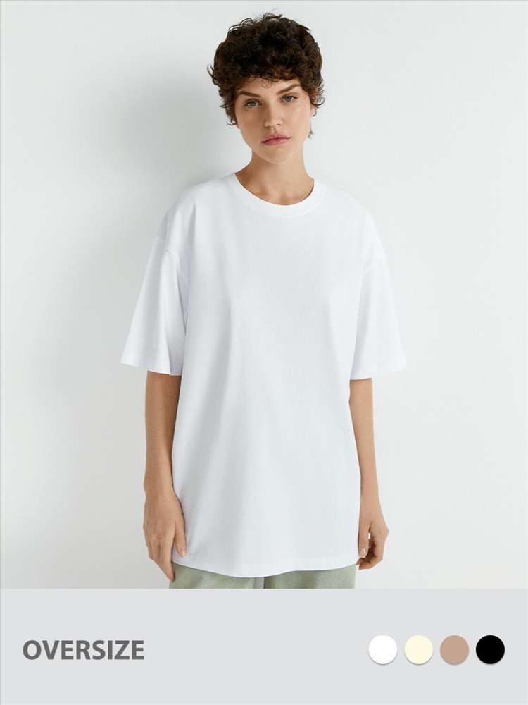 Женская футболка OVERSIZE свободного кроя с удлиненной линией плеча и коротким рукавом. Круглая горловина выполнена из трикотажного материала рибана в стиле «английская резинка». Длина изделия чуть ниже линии бедер.