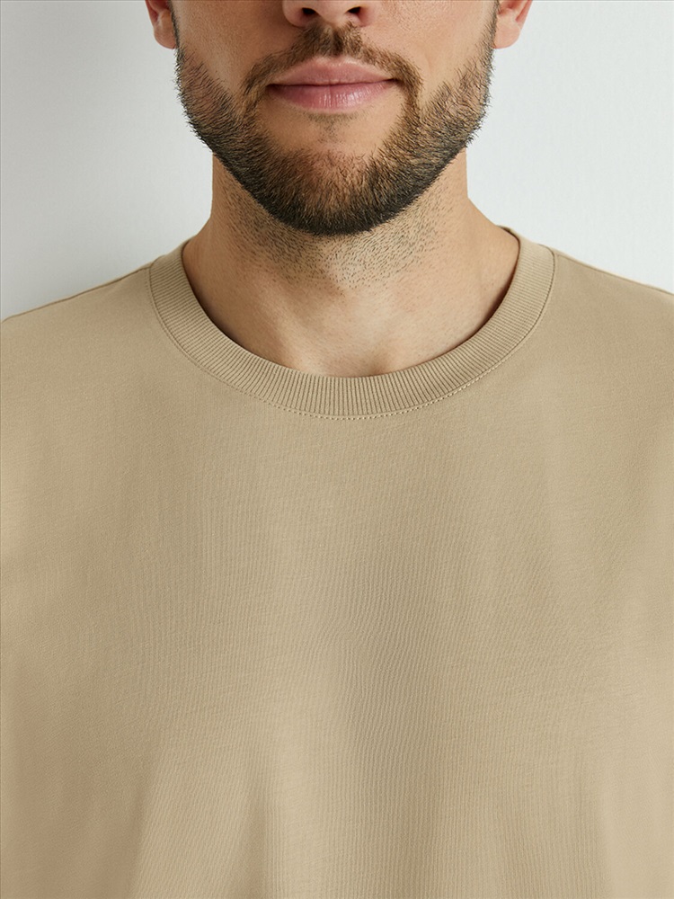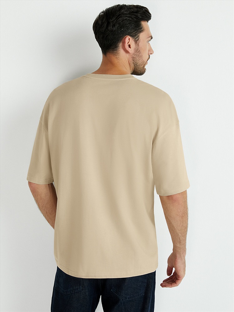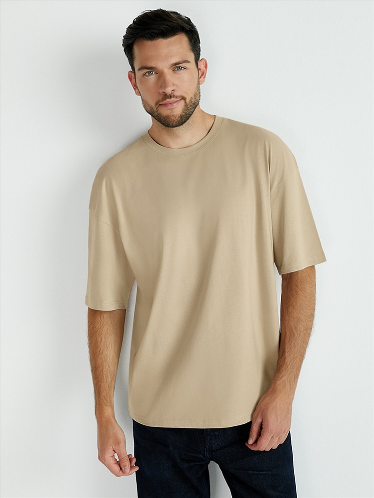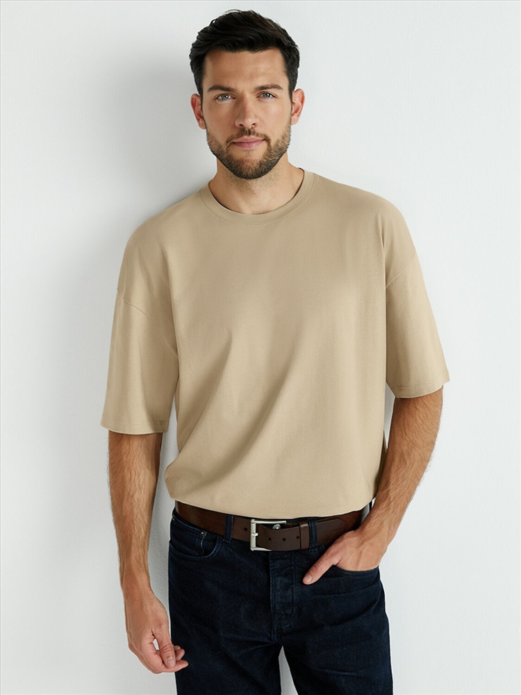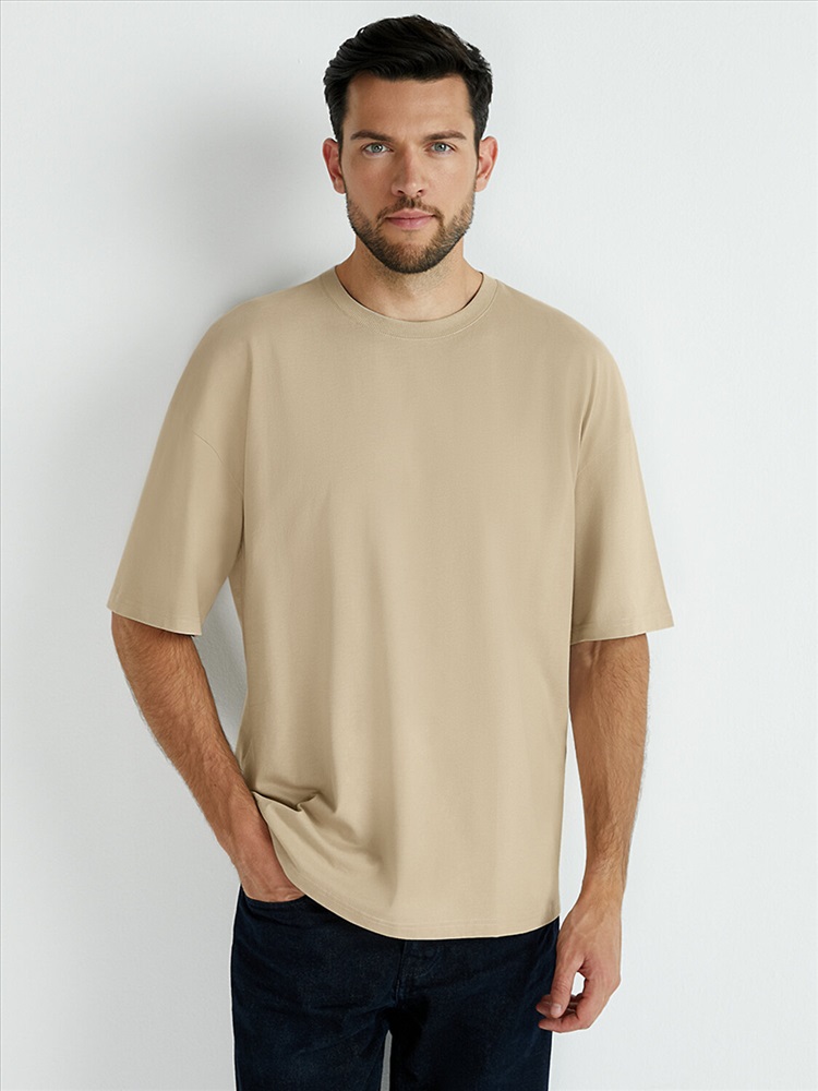 Мужская футболка OVERSIZE свободного кроя с удлиненной линией плеча и коротким рукавом. Круглая горловина выполнена из трикотажного материала рибана в стиле «английская резинка». Длина изделия чуть ниже линии бедер.