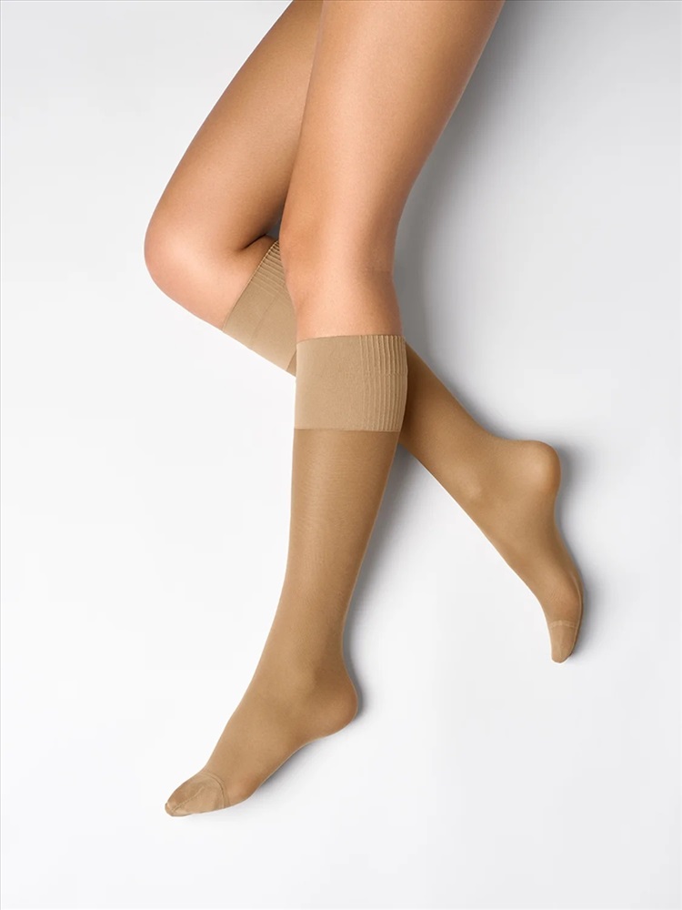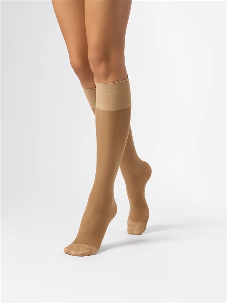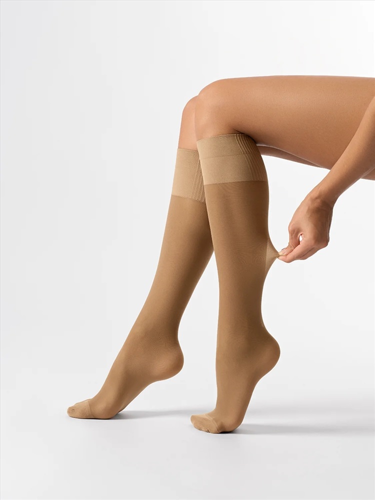 Тонкие матовые эластичные гольфы 20 DEN с распределённым давлением по ноге. Удобная резинка дифференцированной конструкции обеспечивает максимальный комфорт и мягко фиксирует гольфы на ноге, а укреплённый мысок повышает износостойкость и прочность.