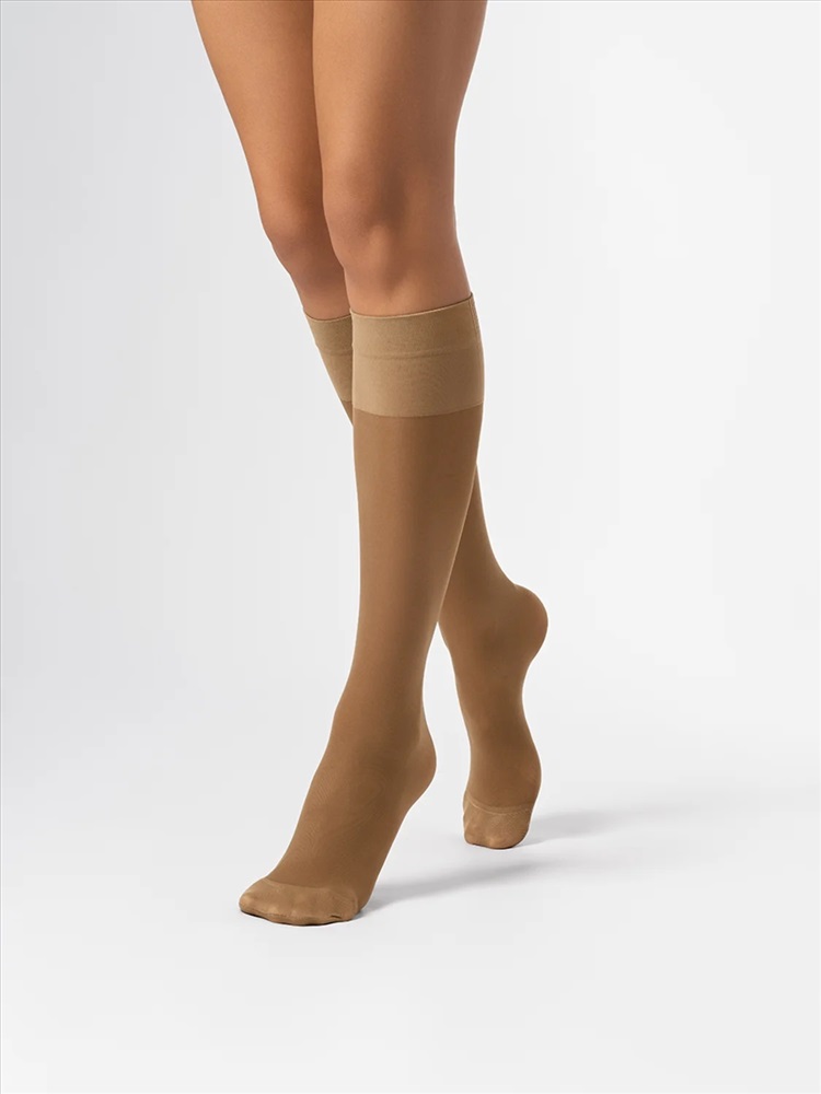 Матовые эластичные гольфы 40 DEN с распределённым давлением по ноге. Удобная резинка дифференцированной конструкции обеспечивает максимальный комфорт и мягко фиксирует гольфы на ноге, а укреплённый мысок повышает износостойкость и прочность.