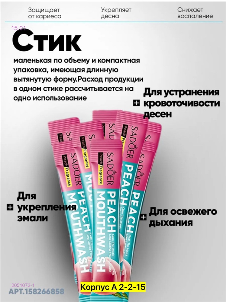 Ополаскиватель для полости рта SADOER в саше со вкусом - это удобный формат для тех, кто хочет всегда иметь свежее дыхание и здоровые зубы в путешествиях, на работе или учебе. В упаковке 20 одноразовых пакетиков