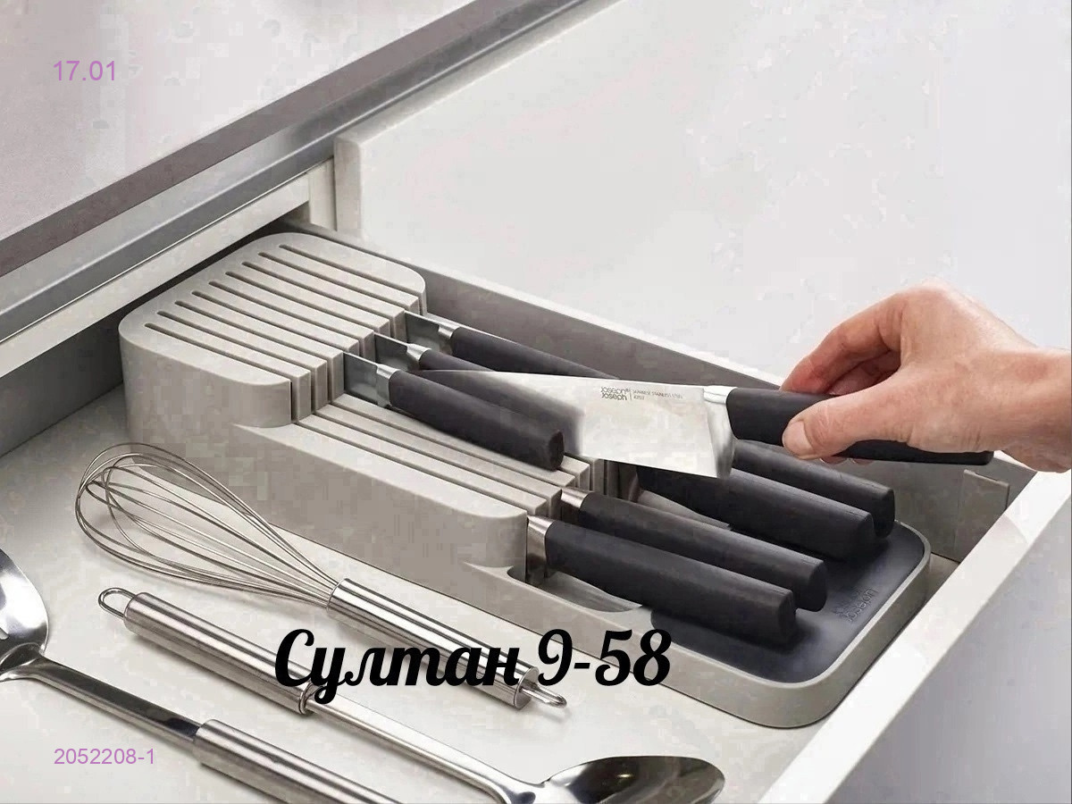 Органайзер для кухонных ножей поможет сэкономить место. На 2-х уровнях расположены держатели для безопасного и компактного хранения ножей с лезвием разной длины: от коротких фруктовых и овощных ножей до длинных разделочных и универсальных. Органайзер рассчитан на количество до 9-ти ножей.