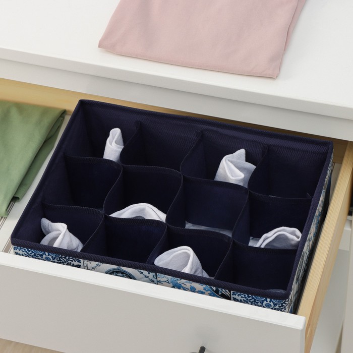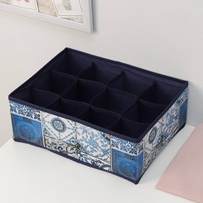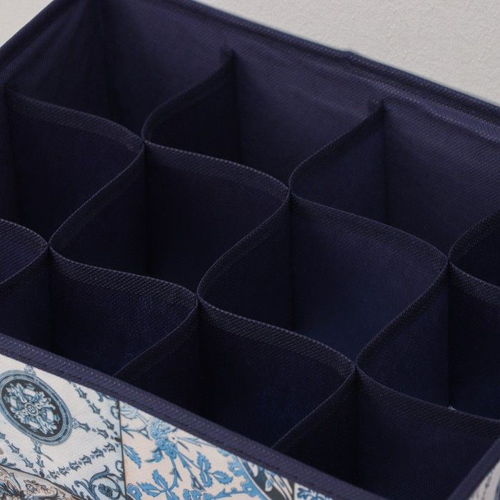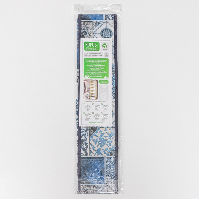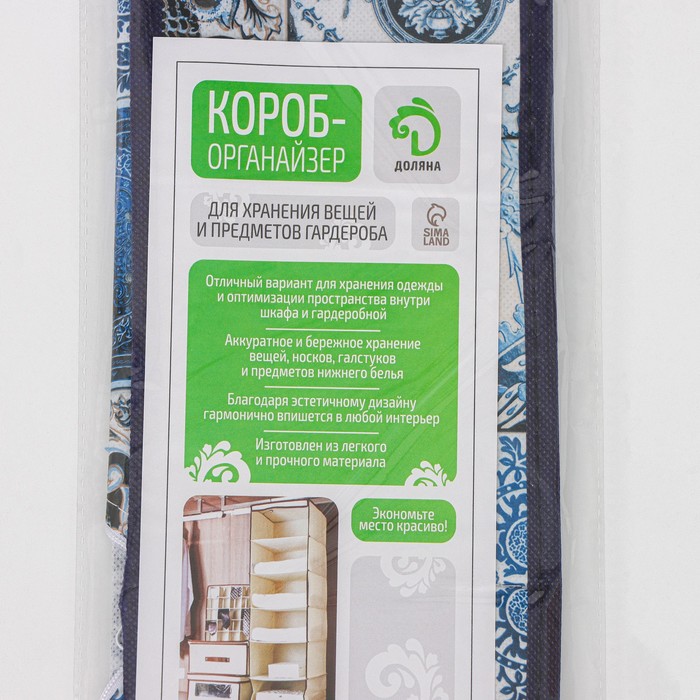 Габариты: 56 x 12 x 1,5 Страна: Китай В боксе: 100 шт Состав: Картон, клеенка, пластик, флизелин Материалы: картон, клеенка, пластик, флизелин Фасовка: по 1 шт Индивидуальная упаковка: Пакет Сертификат: Не подлежит сертификации Цвет: Синий Ширина, см: 32 Высота, см: 12 Глубина, см: 24 Количество ячеек: 12 Рисунок: Да Крышка: Нет Материал: Флизелин Представляем идеальное решение для наведения порядка в Вашем гардеробе - органайзер для хранения белья. Органайзер с 12 отделениями станет полезным в каждом доме и позволит организовать идеальную систему хранения вещей. Применение: