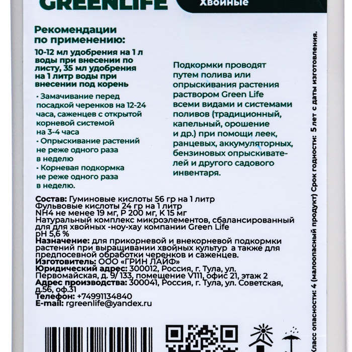 ""Способ применения"":Удобрение "Green Life" рекомендуется применять в период активного роста хвойных растений, начиная с весеннего периода и до конца летнего сезона. Для этого необходимо разбавить указанную дозу удобрения в соответствии с инструкцией на упаковке в определенном объеме воды и равномерно нанести на почву вокруг растений.Итак, органическое удобрение "Green Life" представляет собой эффективное средство для обеспечения здоровья и красоты хвойных растений. Благодаря своему натуральному составу и высокой эффективности, данное удобрение является незаменимым помощником для садоводов и любителей растений, стремящихся обеспечить оптимальные условия для развития своих зеленых подопечных. Комментарии к товару