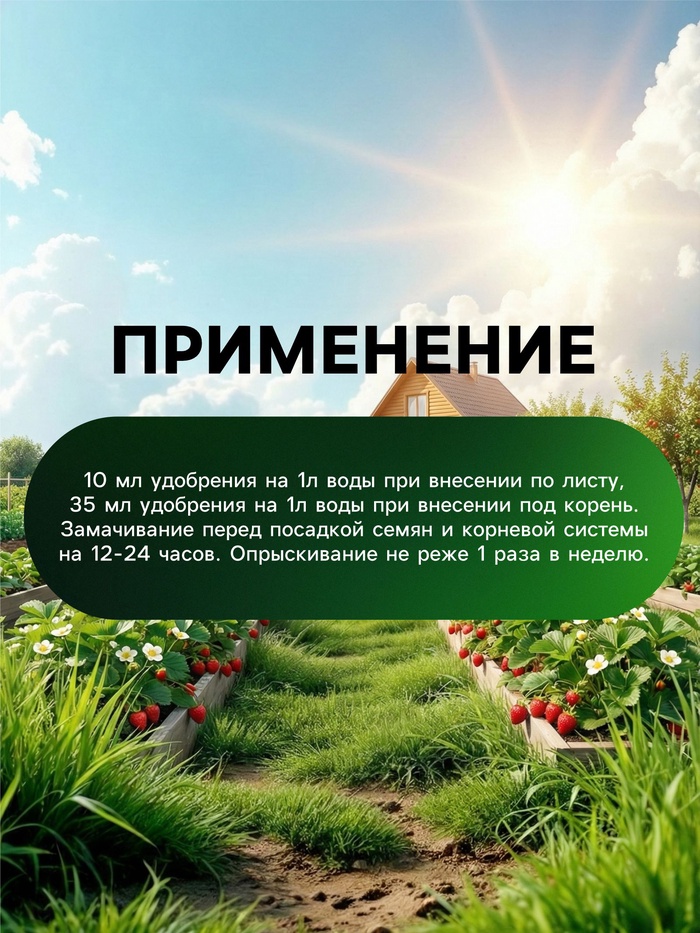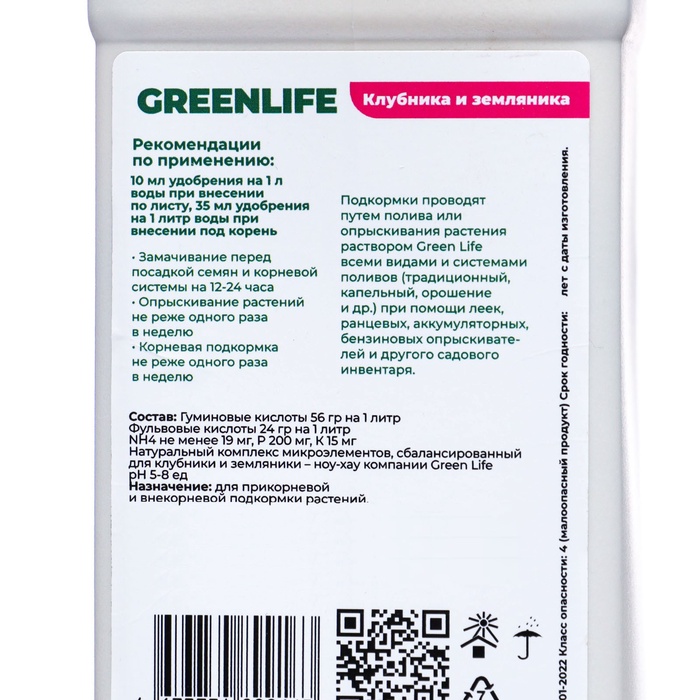 ""Способ применения"":Удобрение "Green Life" рекомендуется применять в соответствии с инструкцией на упаковке. Обычно удобрение вносят в почву во время посадки растений или в период их активного роста. Рекомендуемая дозировка и частота применения зависят от конкретных условий выращивания и требований культуры. Органическое удобрение "Green Life" для клубники и земляники представляет собой эффективное средство для обеспечения здорового роста и развития растений, повышения урожайности и улучшения качества плодов. Продукт ""отличается высокой экологической чистотой и безопасностью"", что делает его предпочтительным выбором для органического земледелия. Регулярное применение удобрения "Green Life" позволит получить отличные результаты в выращивании клубники и земляники, обеспечивая растениям все необходимые питательные вещества для здорового и богатого урожаем роста. Комментарии к товару