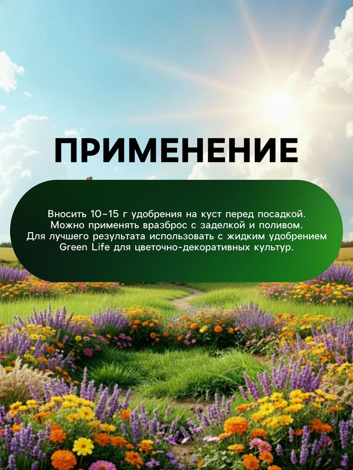 Продукт прошел все необходимые сертификационные испытания и соответствует стандартам качества и безопасности. ""Способ применения"" органического удобрения "Green Life":