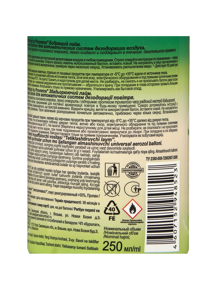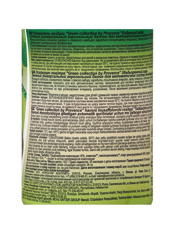 Габариты: 6,5 x 6,5 x 15 Страна: Россия В боксе: 12 шт Состав: См. на упаковке Материалы: см. на упаковке Фасовка: по 1 шт Индивидуальная упаковка: Без упаковки Сертификат: СТР Объём, мл: 250 Аромат: Лайм Форма выпуска: Аэрозоль Принцип работы: Автоматический Вид распыления: Сухое Тип: Сменный баллон Освежитель воздуха «Green collection by Provence», сменный баллон.