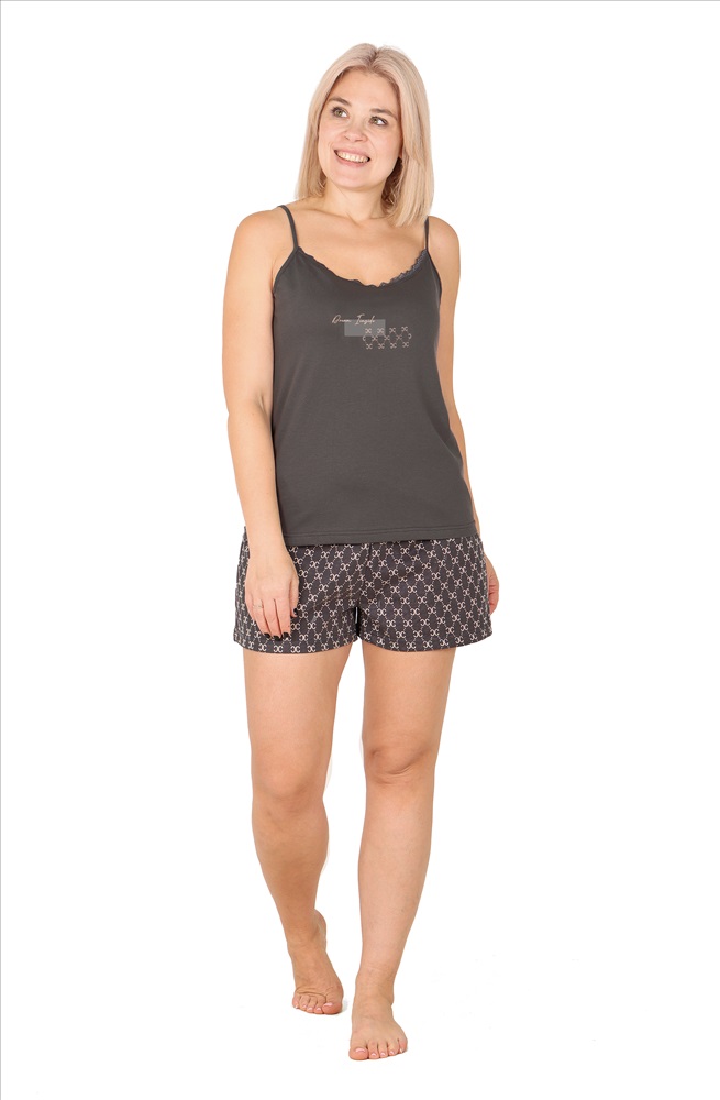 Легкая пижама из 100% хлопка. Майка на бретелях придает образу легкость и элегантность, а кружевные детали добавляют нотку романтики, делая модель особенно привлекательной. Шорты с эластичной резинкой на талии подчеркивает линию бедер, не сковывая при этом движений.