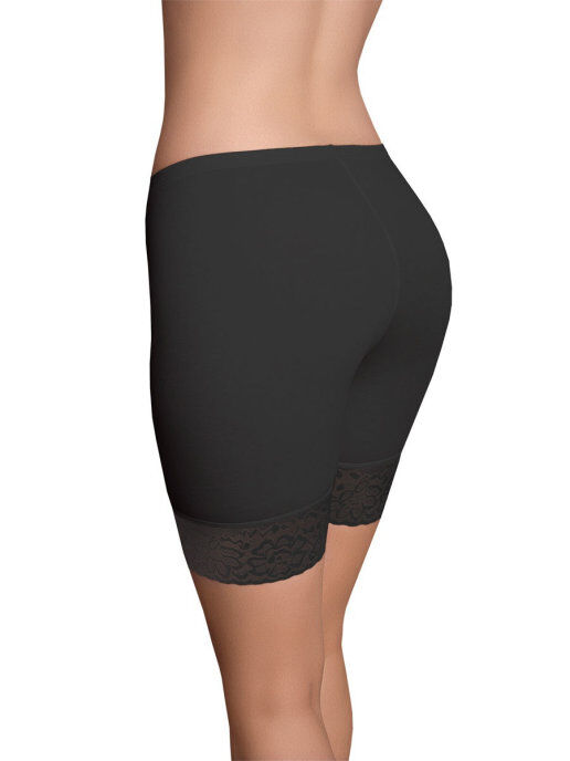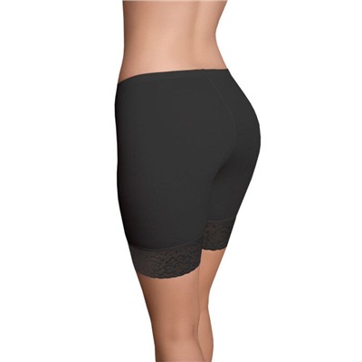 Удлинённые панталоны с высокой линией талии. Низ изделия украшает широкое кружево с цветочным рисунком, за счёт чего модель выглядит нарядно. Пояс обработан в подгиб.