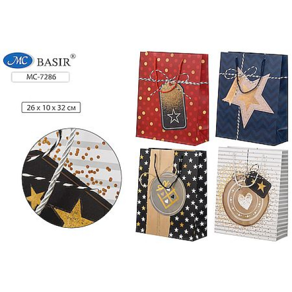 Пакет бумажный 26х32х10 см "ЗВЁЗДЫ,СЕРДЕЧКИ" МС-7286 плотный,цветной с рисунком, ассорти Basir