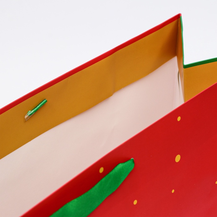 Подарочный новогодний пакет имеет оптимальные размеры, позволяющие упаковать различные предметы, от небольших сувениров до крупных подарков. Он также может быть использован для хранения и транспортировки продуктов питания, например сладких подарков под ёлку, так как материал, из которого он изготовлен, является безопасным для контакта с пищевыми продуктами.