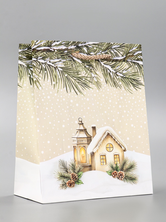 - Уютный праздничный сюжет: Дизайн с новогодним домом вызывает чувство тепла и предвкушения праздника. Такой пакет передает не только подарок, но и эмоции домашнего уюта и семейного торжества.