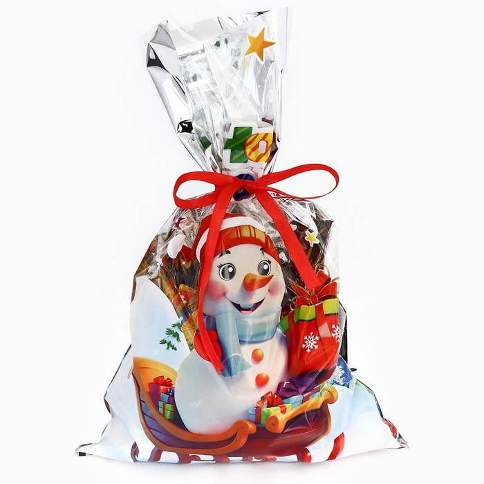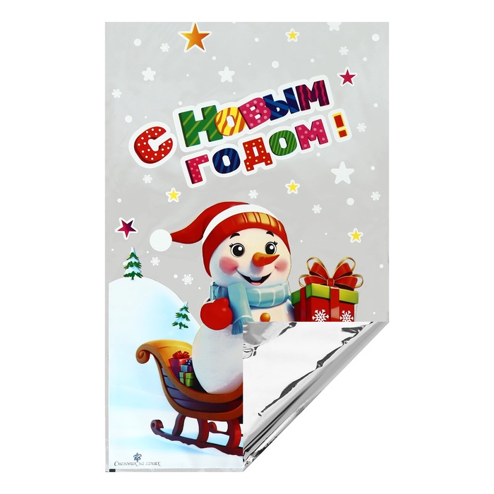 Зимняя сказка для ваших подарков! Металлизированный пакет «Снеговик» (25×40 см) — праздничная упаковка с волшебным дизайном. Серебристая поверхность с изображением снеговика на санях создаёт новогоднее настроение.
