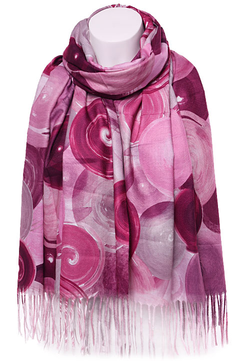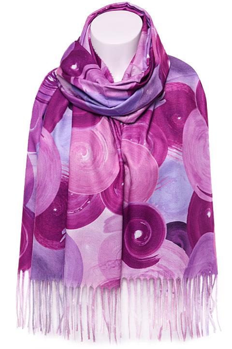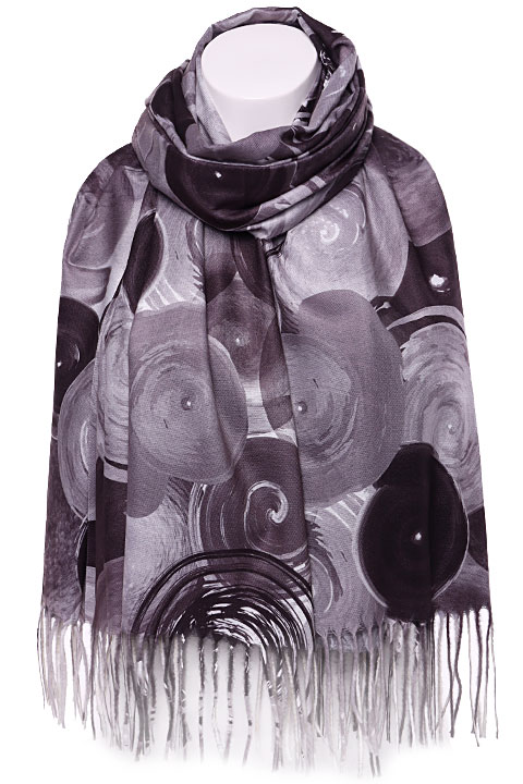 Палантин мягкий, плотный, двухсторонний. Одна сторона - круги, другая сторона - разводы. Края палантина заканчиваются кромкой, концы - бахрома.