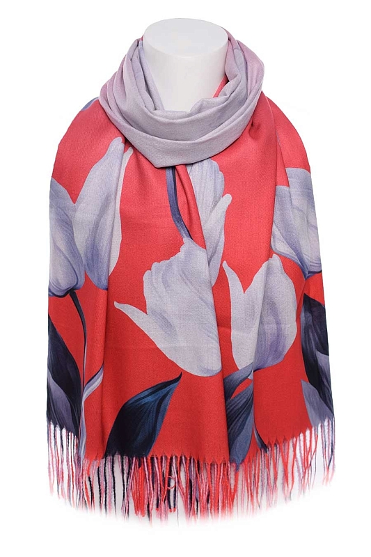 Мягкий, плотный двухсторонний палантин. Одна сторона - рисунок, другая - однотонная. На двух противоположных краях кисти, два других заканчиваются кромкой.