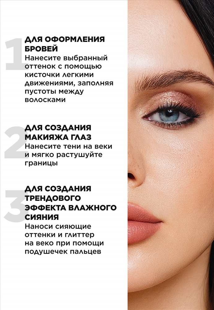 Срок годности: 3 года с даты изготовления СоставTalc, Mica, Magnesium Stearate, Paraffinum Liquidum, Polybutene, Isopropyl Palmitate, Phenoxyethanol. Может содержать: CI77499, CI77491, CI77492, CI77891. Способ примененияДля оформления бровей нанесите выбранный оттенок с помощью кисточки легкими движениями, заполняя пустоты между волосками. Для создания макияжа глаз нанесите тени на веки и мягко растушуйте границы. Чтобы добиться трендового эффекта влажного сияния, наносите сияющие оттенки при помощи подушечек пальцев. Комментарии к товару