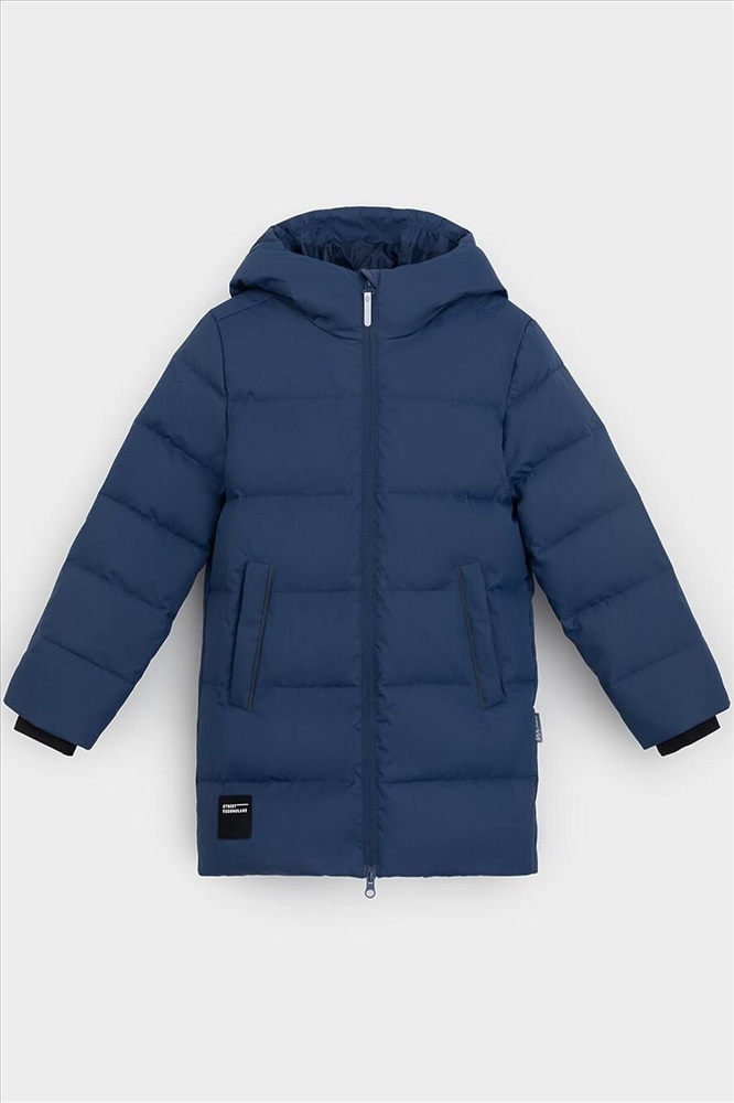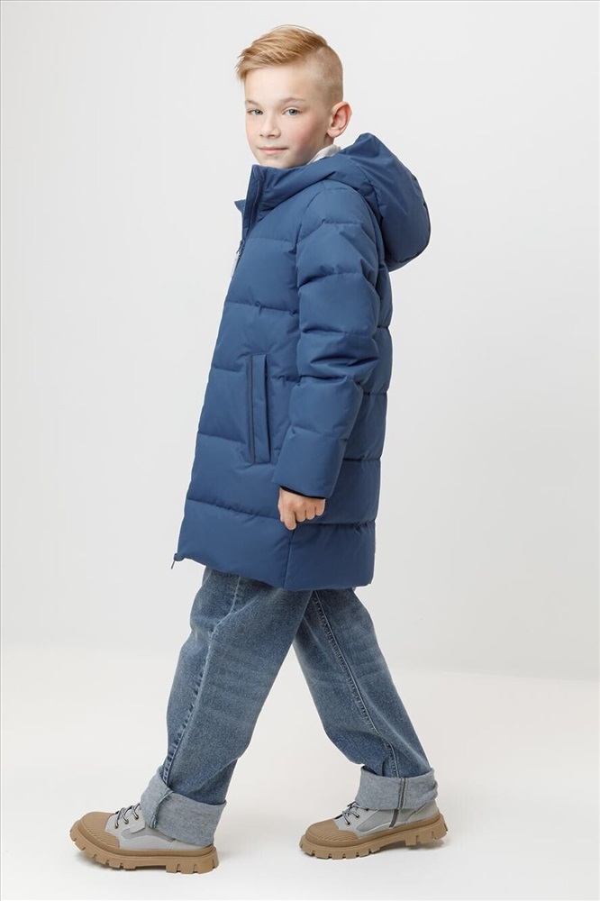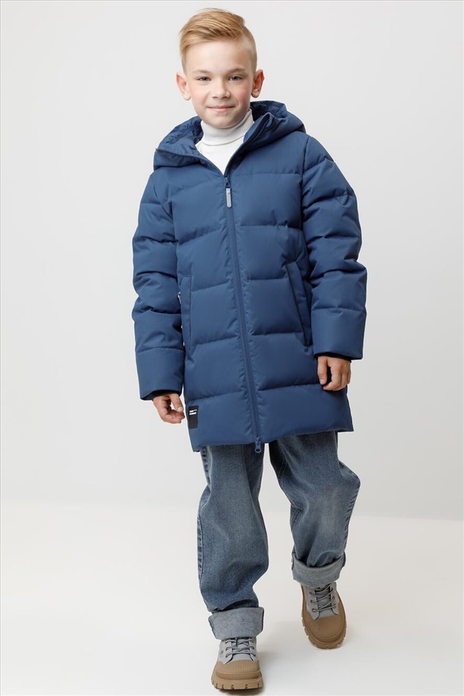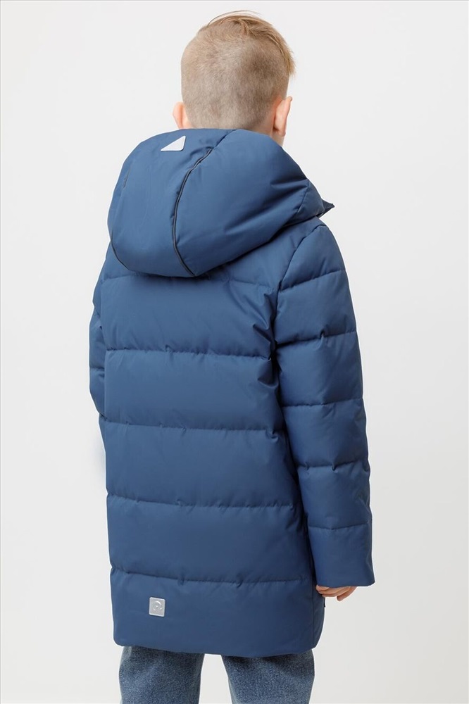 Зимнее пальто для мальчика с натуральным утеплителем из гусиного пуха (70%) и пера (30%). Выполнено из мембранной ткани с дополнительной тефлоновой обработкой, которая предохраняет изделие от загрязнений и отталкивает влагу. Подклад выполнен из 100% полиэстера. Пальто застёгивается на молнию, предусмотрена защита подбородка. Несъёмный капюшон имеет эластичные утяжки. По бокам два кармана на молнии, так же имеется внутренний карман. В рукавах мягкие внутренние манжеты. Во всех изделиях верхнего ассортимента для безопасности ребёнка предусмотрены светоотражающие элементы.
