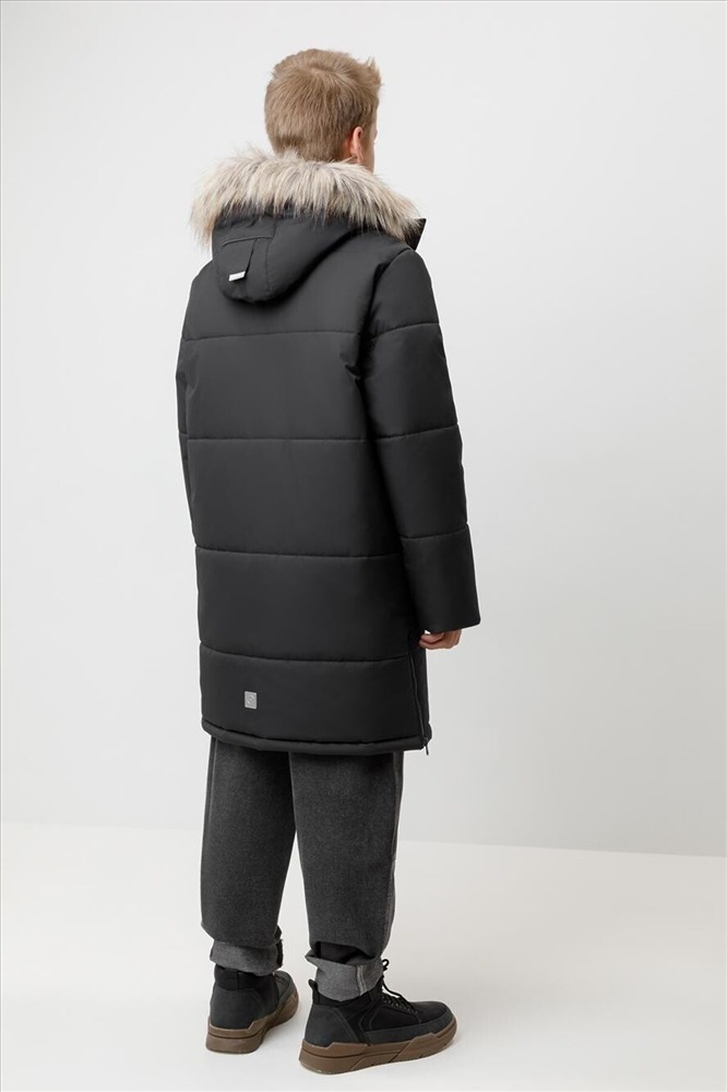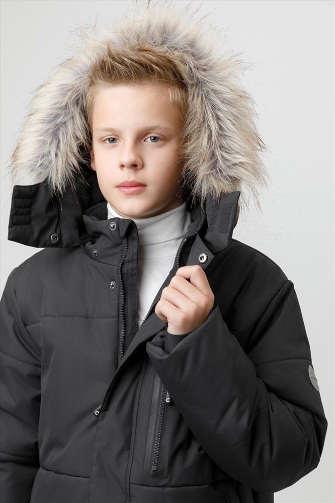 Зимнее пальто для мальчика с утеплителем SEE®: 300 г/м2. Выполнено из мембранной ткани с дополнительной тефлоновой обработкой, которая предохраняет изделие от загрязнений и отталкивает влагу. Подклад выполнен из 100% полиэстера Tricot. Пальто застёгивается на молнию и внешнюю планку с кнопками. Съёмный капюшон имеет эластичную утяжку со стопперами и отстёгивающийся мех на молнии, регулируется по глубине с помощью липучки. На рукавах внутренние эластичные манжеты. По бокам два кармана на молниях и один карман на груди. Во всех изделиях верхнего ассортимента для безопасности ребёнка предусмотрены светоотражающие элементы.