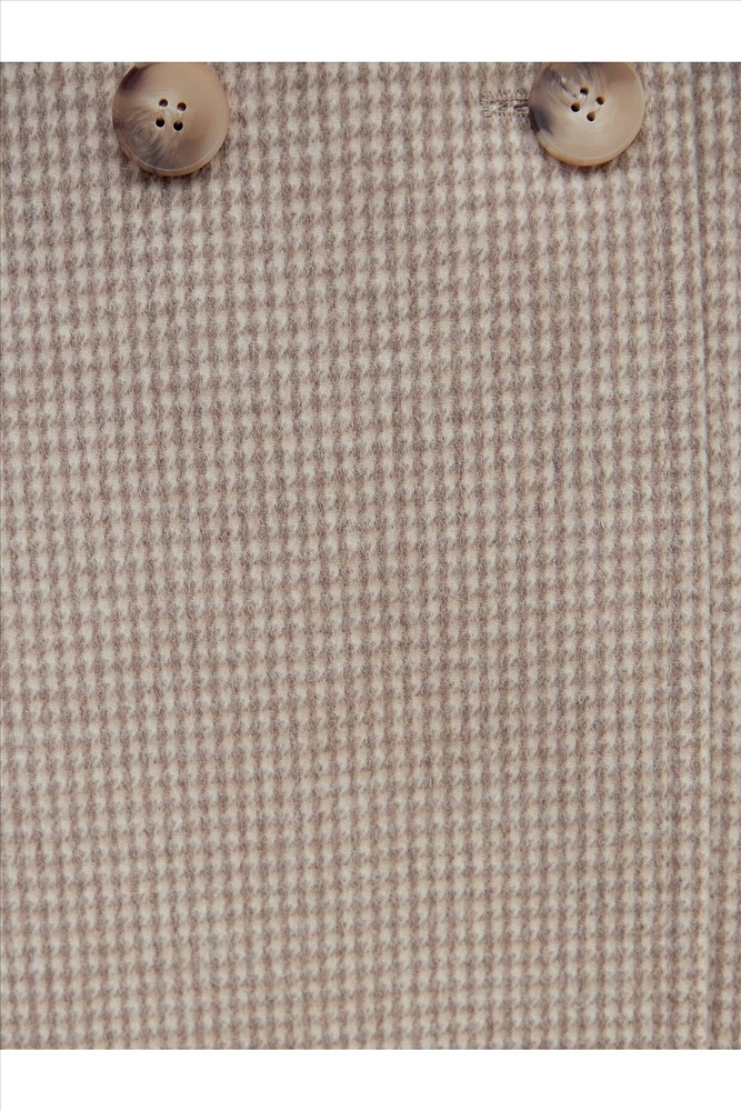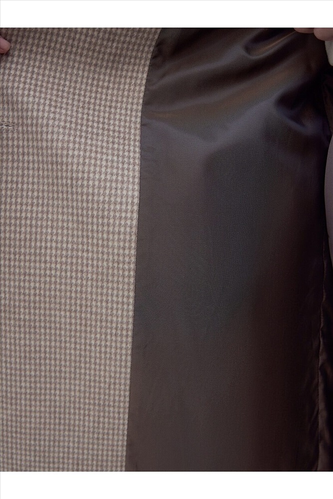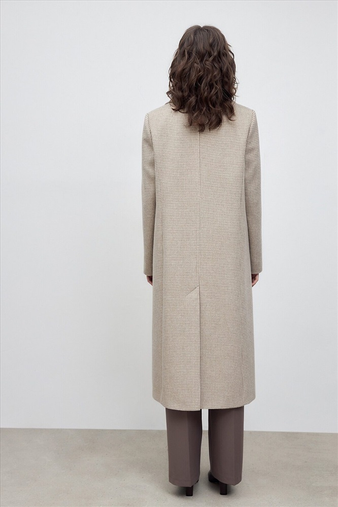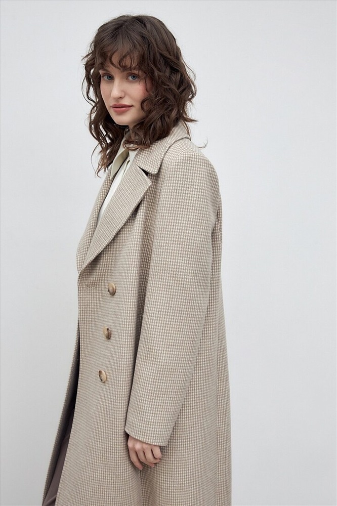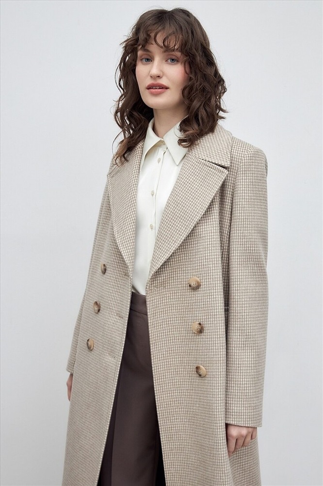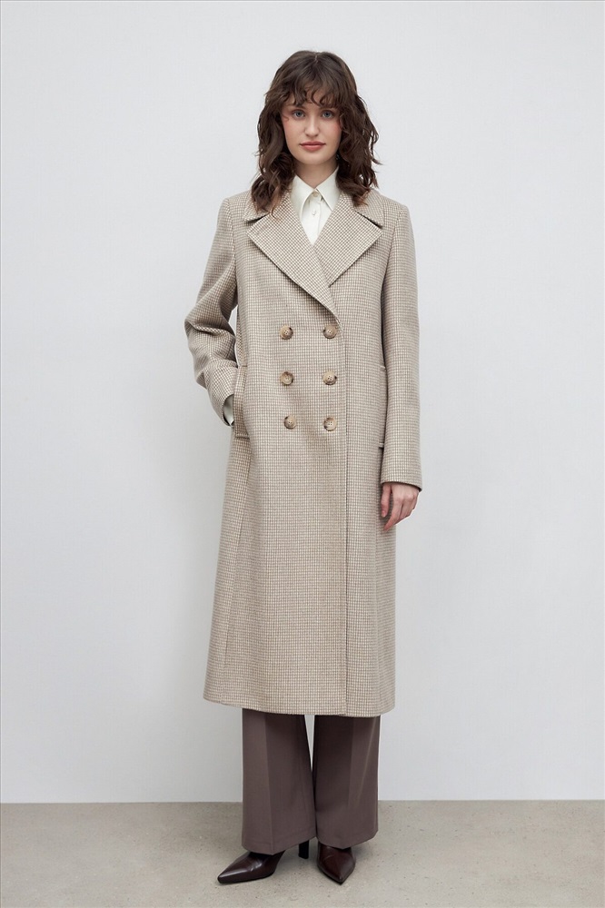 Двубортное пальто в нежном бежево-коричневом пье-де-пуле. Пальто сшито из премиальной твидовой ткани с высоким содержанием шерсти. Классический английский воротник, который можно застегнуть полностью, и модный втачной рукав делают это изделие стильным и удобным. Женственный полуприлегающий силуэт достигается за счет двух рельефных швов спереди. По бокам в швах располагаются вместительные карманы с листочками. Пальто декорировано отделочной строчкой. Застежка на три ряда крупных матовых пуговиц. Для наилучшей защиты от непогоды изделие выполнено с использованием высокотехнологичной мембраны RaftPro, а спинка пальто имеет дополнительное утепление. Произведено в Санкт-Петербурге.
