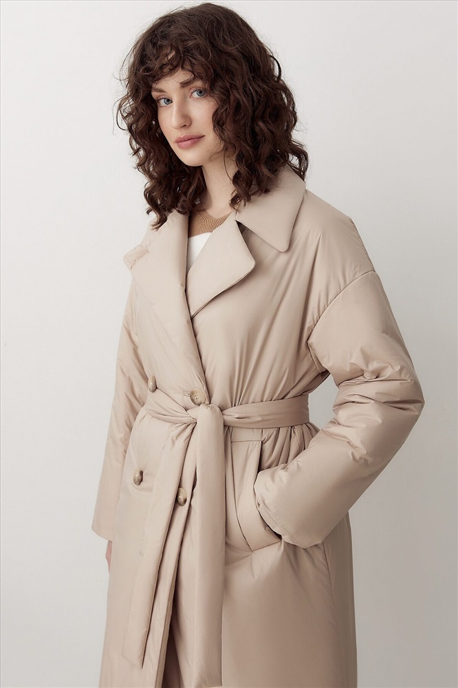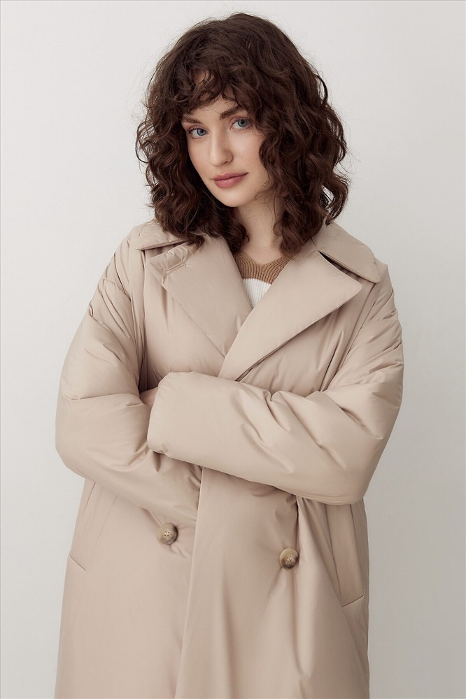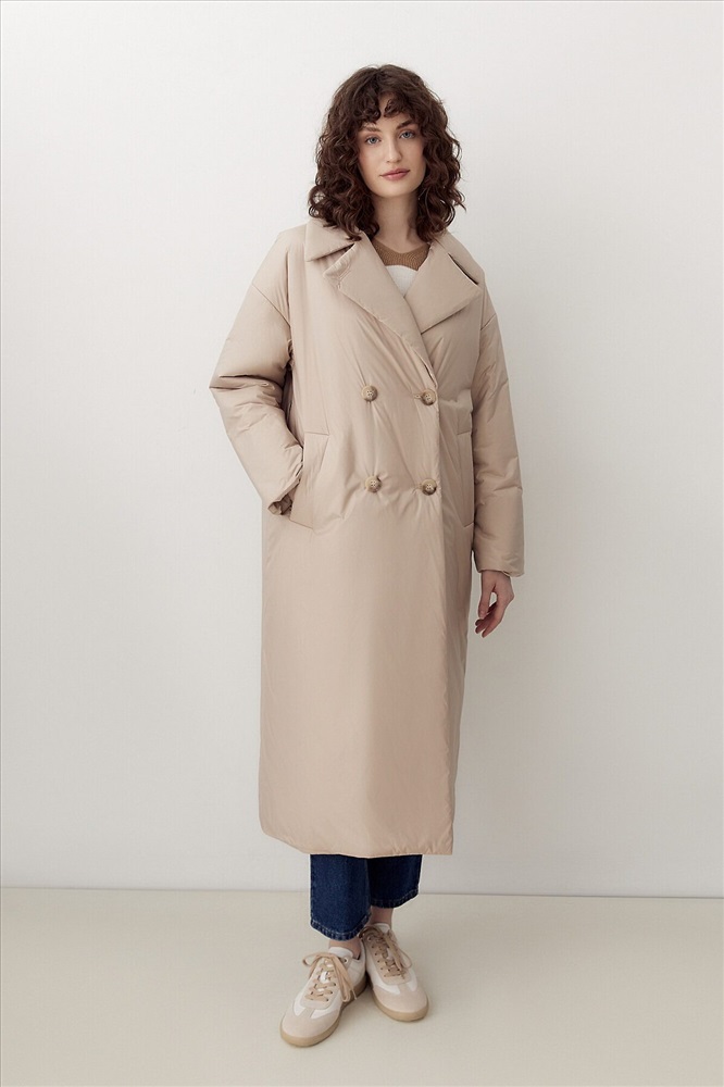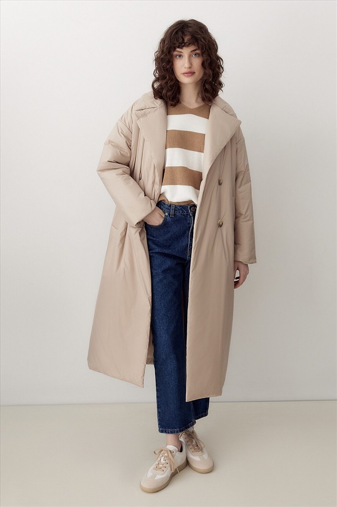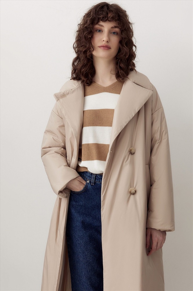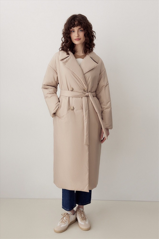 Утепленное пальто прямого силуэта из плащевой ткани модного оттенка "миндальное молоко". Пальто имеет классический английский воротник и комфортный рубашечный рукав с отворотами по низу. По бокам располагаются глубокие карманы с листочками. Длина изделия ниже колена. Застегивается на два ряда крупных роговых пуговиц. Пальто дополняет пояс из основной ткани. А для дополнительной защиты от ветра и холода пальто выполнено с использованием высокотехнологичной мембраны RaftPro и современного легкого утеплителя. Произведено в Санкт-Петербурге.