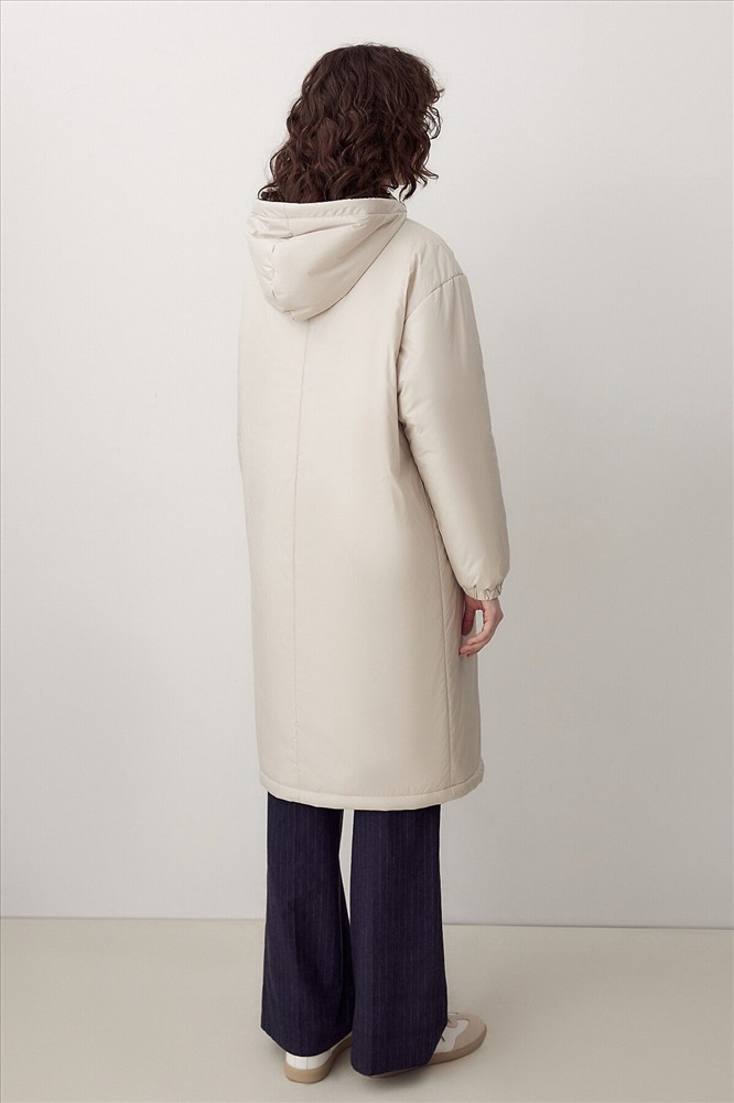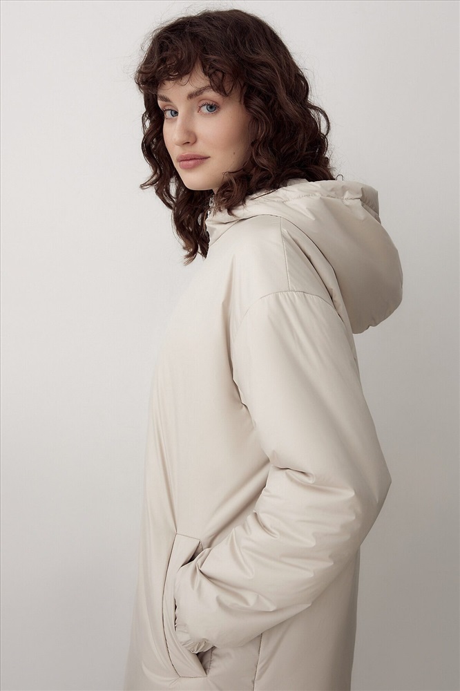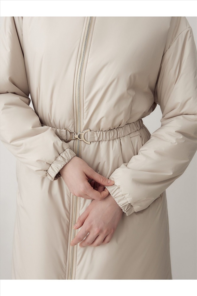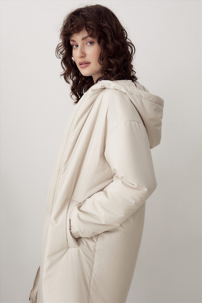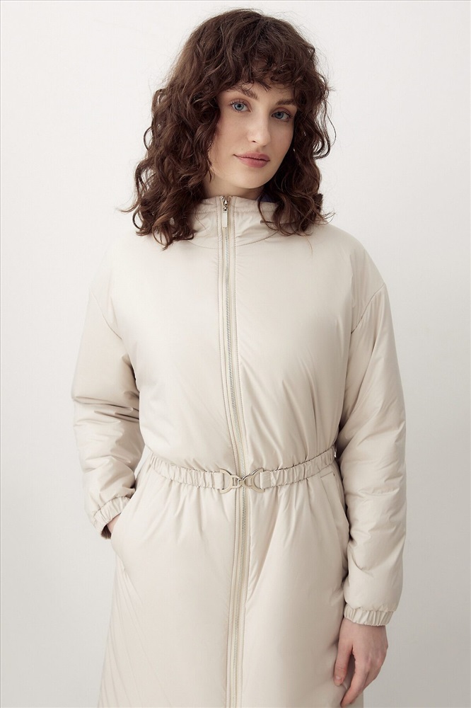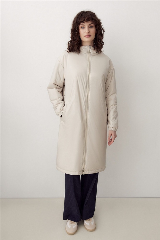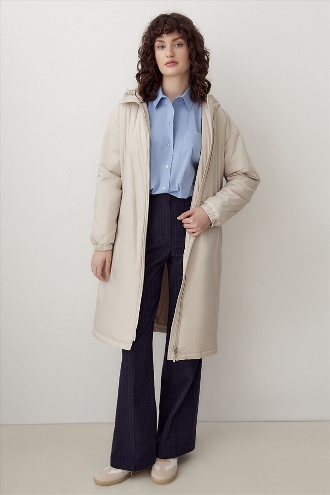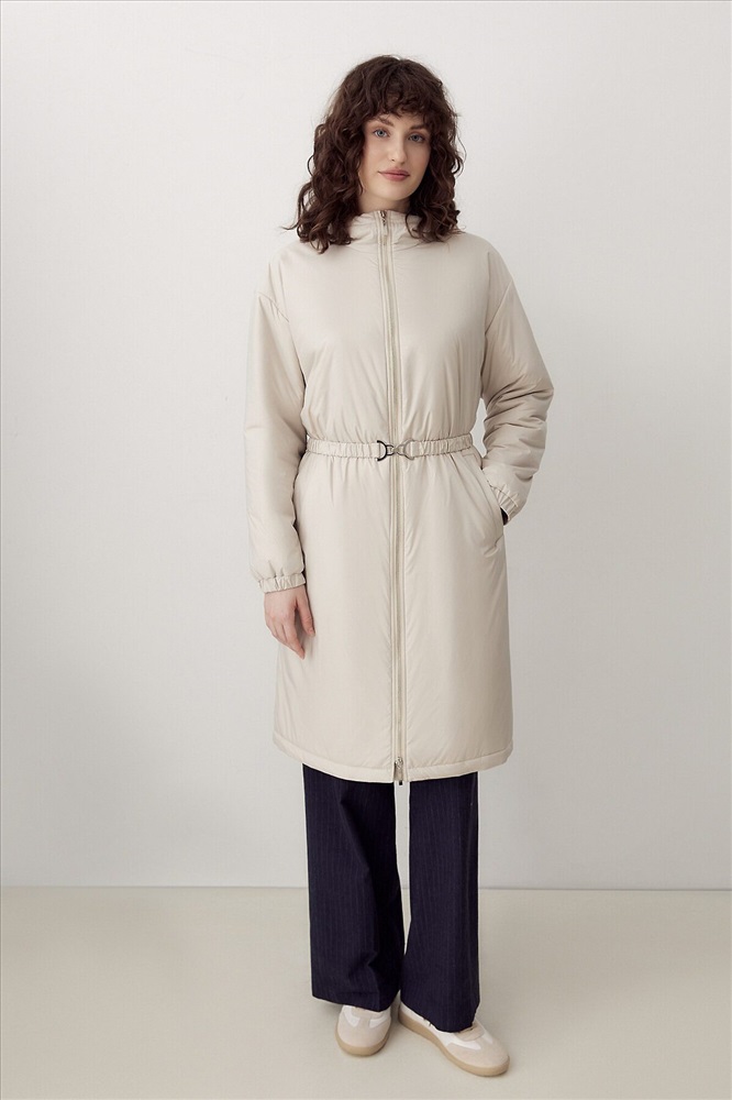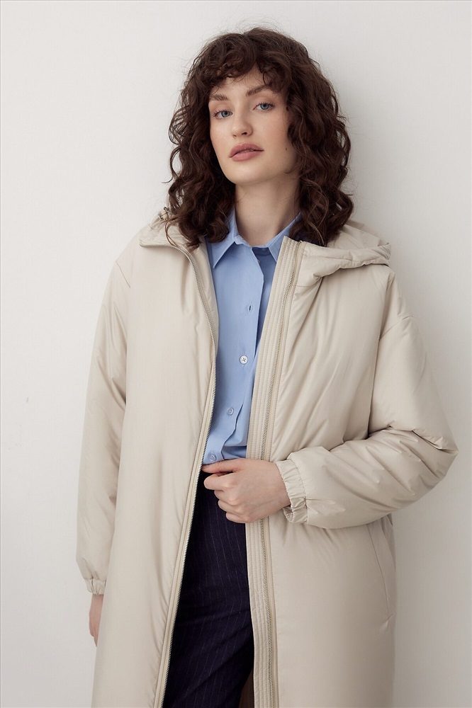 Утепленное пальто прямого силуэта из плащевой ткани светлого жемчужного оттенка. Пальто имеет множество функциональных деталей. Рубашечный рукав не стесняет движений, низ рукава собран на резинку. Горловину обрамляет воротник-стойка с капюшоном, надежно защищающим от дождя и ветра. Изящный тонкий пояс на резинке из основной ткани с лаконичной пряжкой-крючком гармонично подчеркивает талию. Пальто имеет универсальную длину до колена и застежку на легкую пластиковую молнию. А для дополнительной защиты от ветра и холода пальто выполнено с использованием высокотехнологичной мембраны RaftPro и современного легкого утеплителя. Произведено в Санкт-Петербурге.