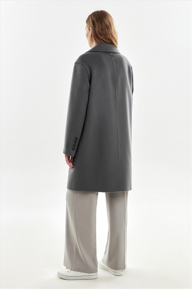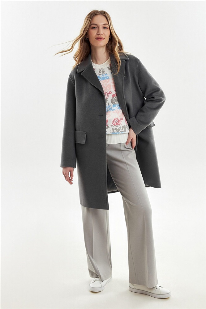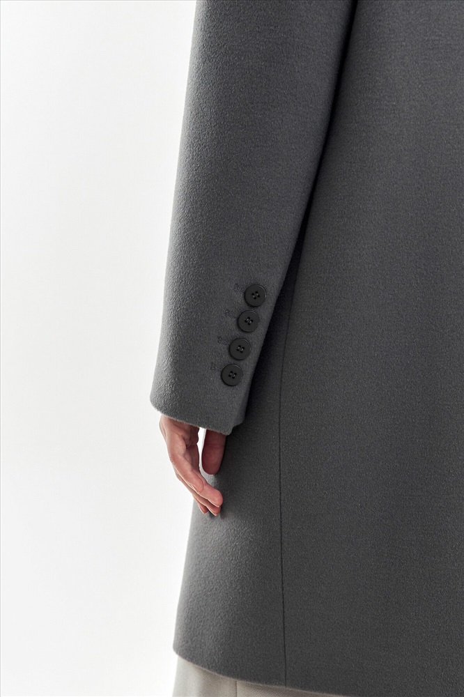 Однобортное пальто длиной до колена из премиальной шерстяной ворсовой ткани классического темно-серого оттенка. Пальто расширенного силуэта "трапеция" со свободным рубашечным рукавом и аккуратным английский воротником. По низу рукава застежка на ряд пуговиц. Спереди располагаются глубокие прорезные карманы с клапанами. Застегивается изделие на ряд крупных стильных глянцевых пуговиц в цвет ткани. А для дополнительной защиты от непогоды изделие выполнено с использованием высокотехнологичной мембраны RaftPro. Произведено в Санкт-Петербурге.
