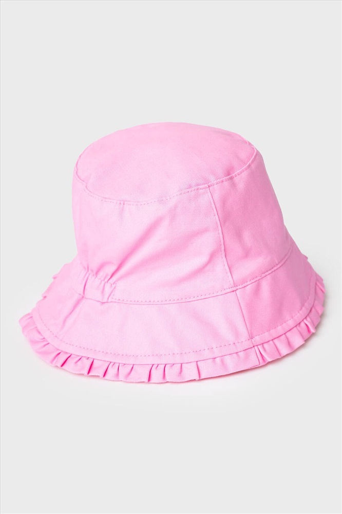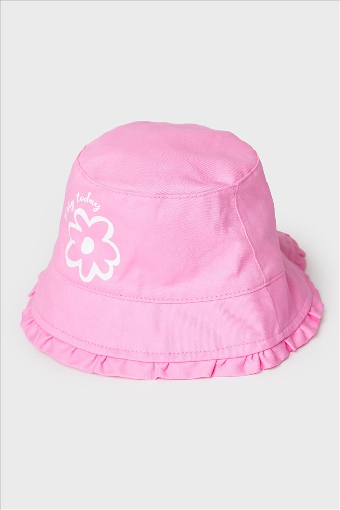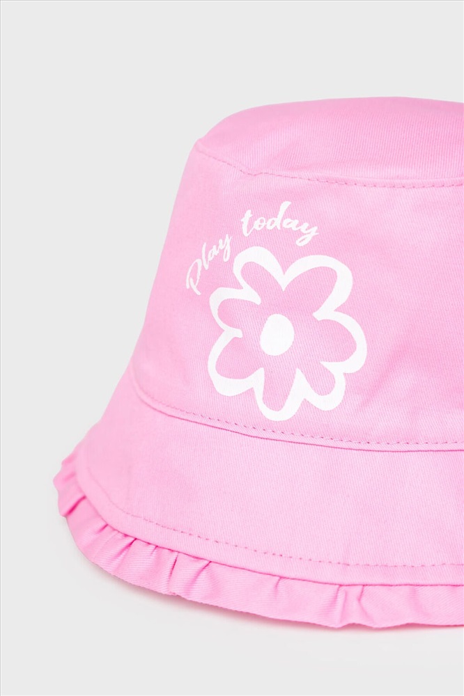 Детская панама для девочки. Модель в нежно-розовом цвете с широкими полями, украшенными оборкой по краю, создаёт лёгкий образ. На передней части — белый принт в виде цветка. Сзади встроена эластичная резинка, чтобы панама удобно сидела на голове. Внутри предусмотрена подкладка, а по бокам — маленькие вентиляционные отверстия.