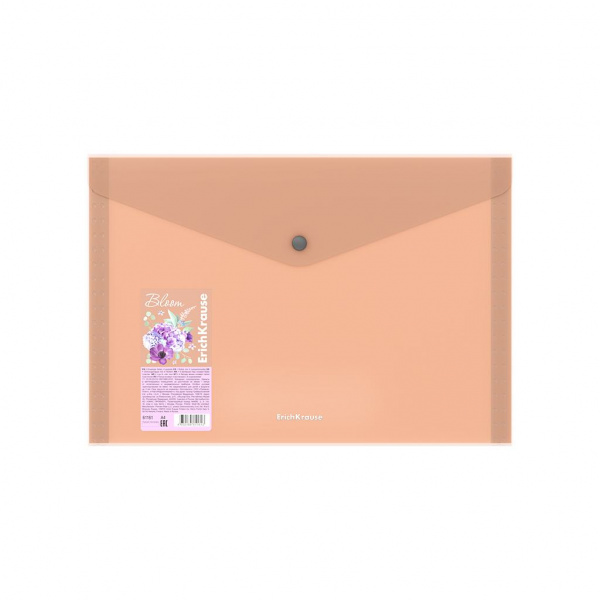 Папка-конверт на кнопке прозрачная с 4 цветными отделениями формата А4 из высококачественного непрозрачного пластика с текстурой поверхности "песок", на которой не видно отпечатков пальцев и мелких царапин. Предназначена для хранения и транспортировки небольшого количества документов. Цвет папки - ассорти: голубой, зеленый, персиковый, фиолетовый. Надежная застежка-кнопка обеспечивает быстрый доступ к документам. Папка вмещает до 120 бумажных листов. Размер - 330х233х9мм, толщина - 0.6мм. Код и баркод на каждой единице товара.