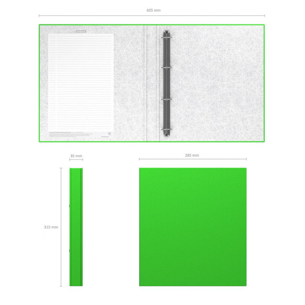Папка - регистратор формата А4 снабжена механизмом на O-кольцах диаметром 25 мм. Изготовлена из картона толщиной 1,75 мм, покрытого бумагой со структурным тиснением и водоотталкивающей поверхностью. Корешок шириной 35 мм. Вместительность до 250 листов бумаги плотности 80 г/м?. На форзаце есть шаблон для оглавления. Удобна для проведения презентаций, представления документации на семинарах.