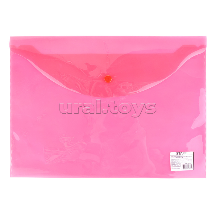 • Папка для хранения документов. • Формат: 34х24 см. • Застёгивается на кнопку. • Материал: пластик. • Соответствует требованиям безопасности продукции. • Для детей от 6 лет.