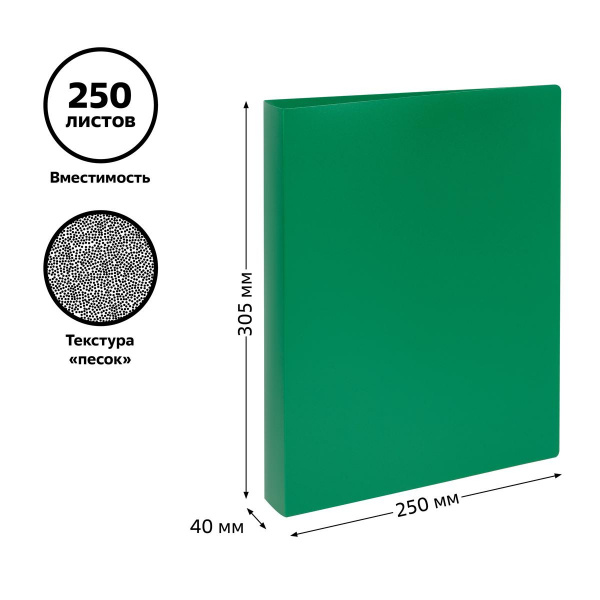 Папка на 2 кольцах «СТАММ» предназначена для хранения перфорированных документов формата А4. Цвет папки – зелёный. Изготовлена из качественного полипропилена плотностью 500 мкм с текстурой «песок». Размер изделия составляет 310*250 мм. Ширина корешка 40 мм позволяет вмещать в папку до 250 листов. Кольцевой механизм, состоящий из 2 колец диаметром 25 мм, надежно держит документы. Папка упакована в индивидуальный пакет.