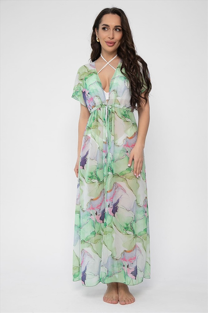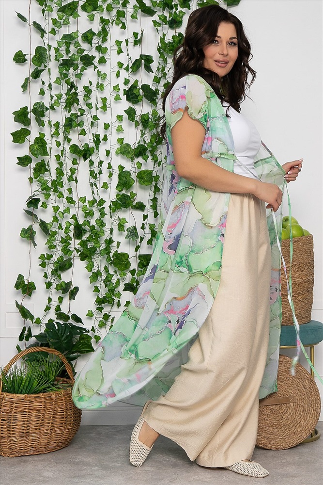 Состав : 100% полиэстер Материал : шифон Цвет : Зеленый Принт : разводы Длина : миди Силуэт : оверсайз Карманы : Отсутствуют Подкладка : Отсутствует Вид застежки : завязки Декоративные элементы : отсутствуют Длина : 44-136 см, 46-136 см, 48-137 см, 50-137 см.