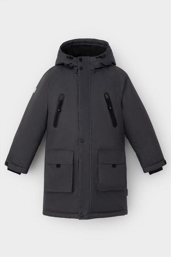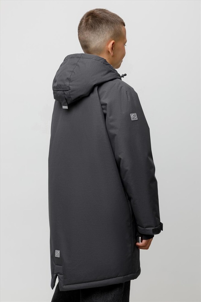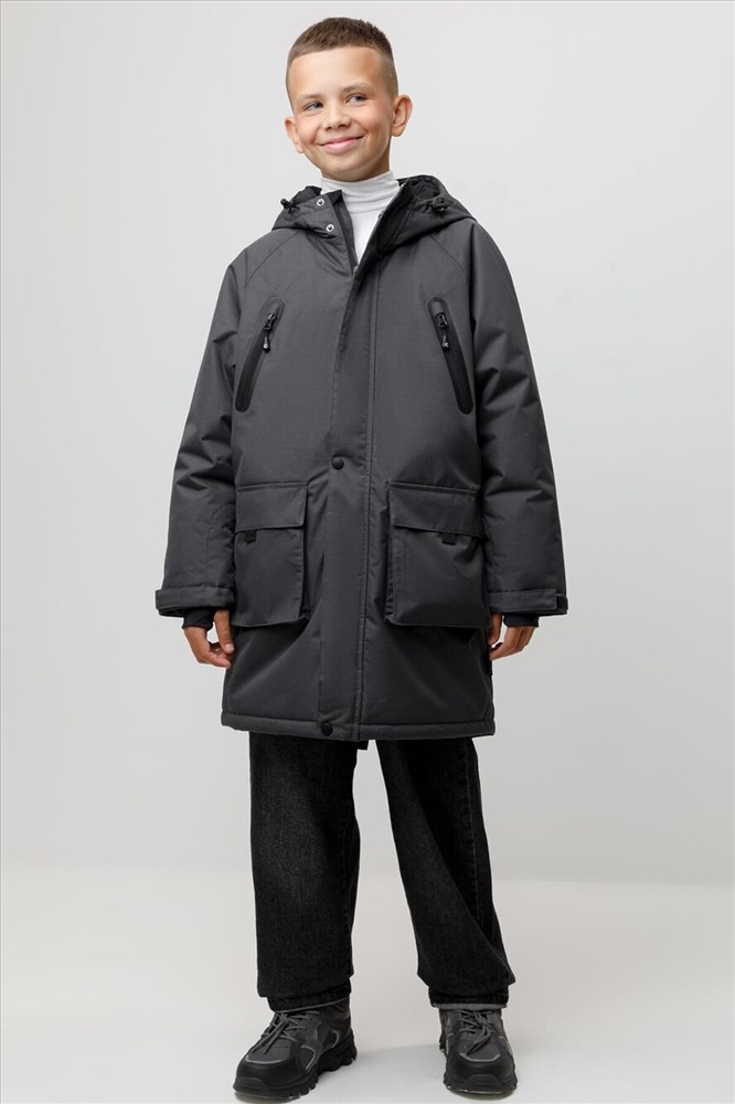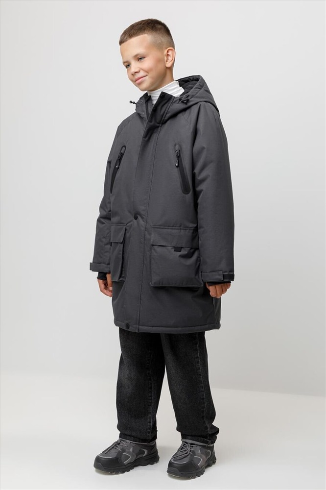 Зимняя парка для мальчика с утеплителем Fellex®: 250 г/м2. Выполнена из мембранной ткани с дополнительной тефлоновой обработкой, которая предохраняет изделие от загрязнений и отталкивает влагу. Подклад выполнен из 100% полиэстера Tricot. Парка застёгивается на молнию и внешнюю планку с кнопками, предусмотрена защита подбородка. Вшитый капюшон затягивается на эластичную утяжку со стопперами и на шнур. На рукавах внутренние эластичные манжеты, ширина регулируется липучками. Два накладных кармана с клапанами по бокам и два кармана на груди. По талии эластичная утяжка со стопперами. Во всех изделиях верхнего ассортимента для безопасности ребёнка предусмотрены светоотражающие элементы.