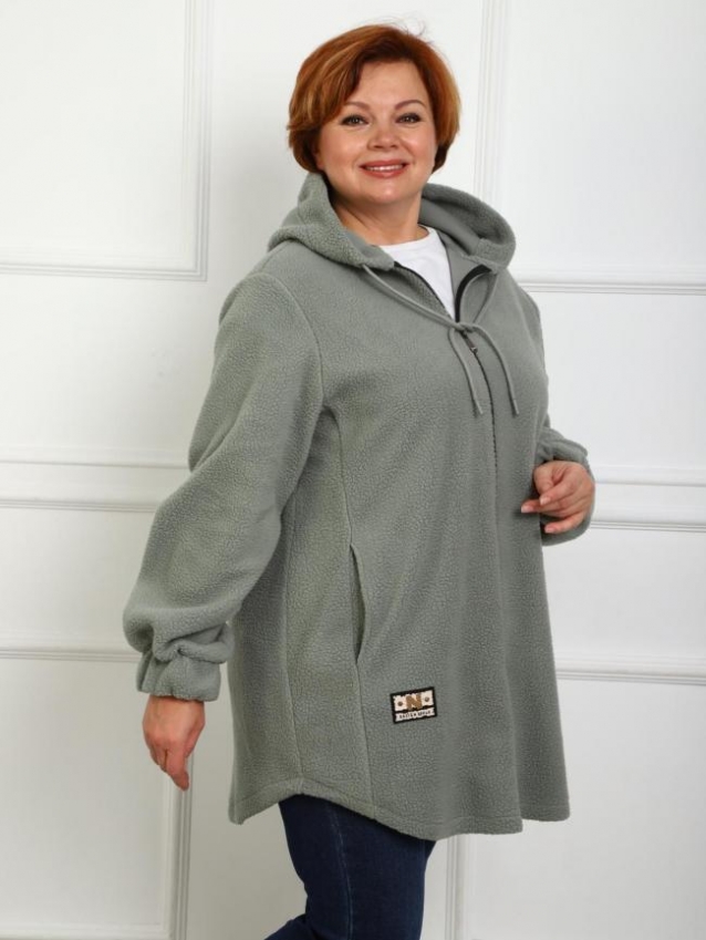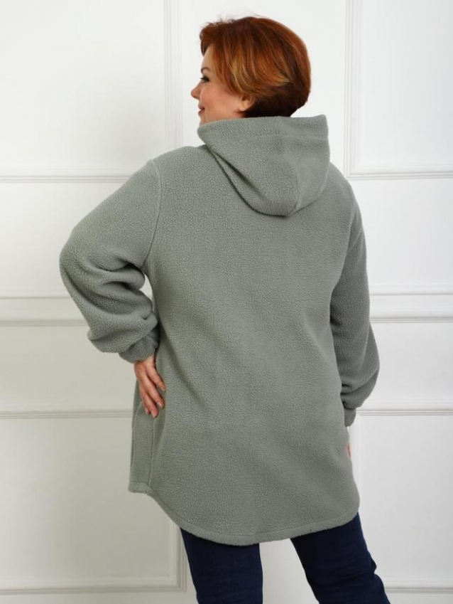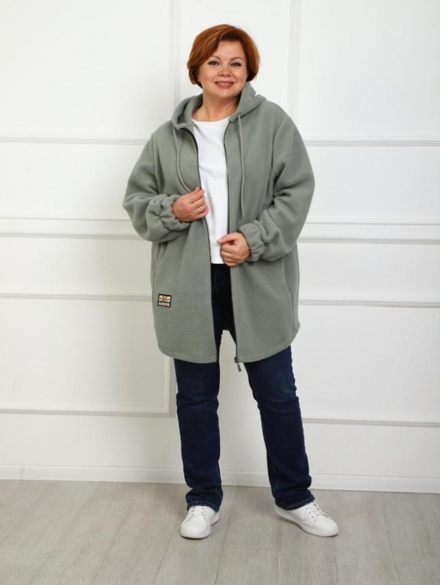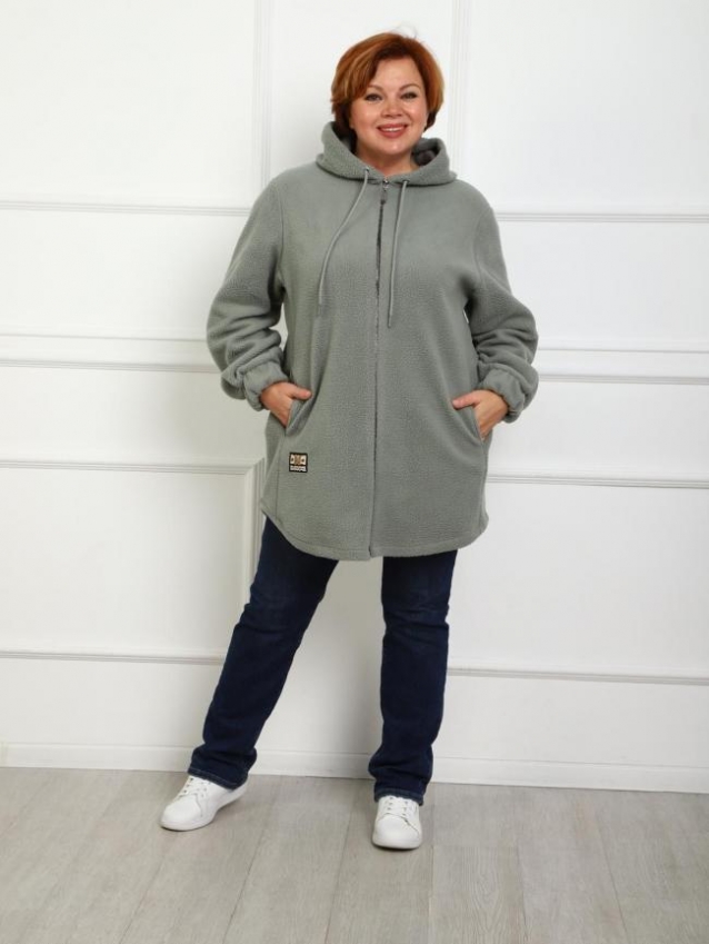 Парка выполнена из флиса барашек. Модель удлиненного кроя на молнии с внутренними карманами. Низ изделия имеет небольшие закругления, капюшон с люверсом и шнурком, длинный рукав с манжетом на резинке.