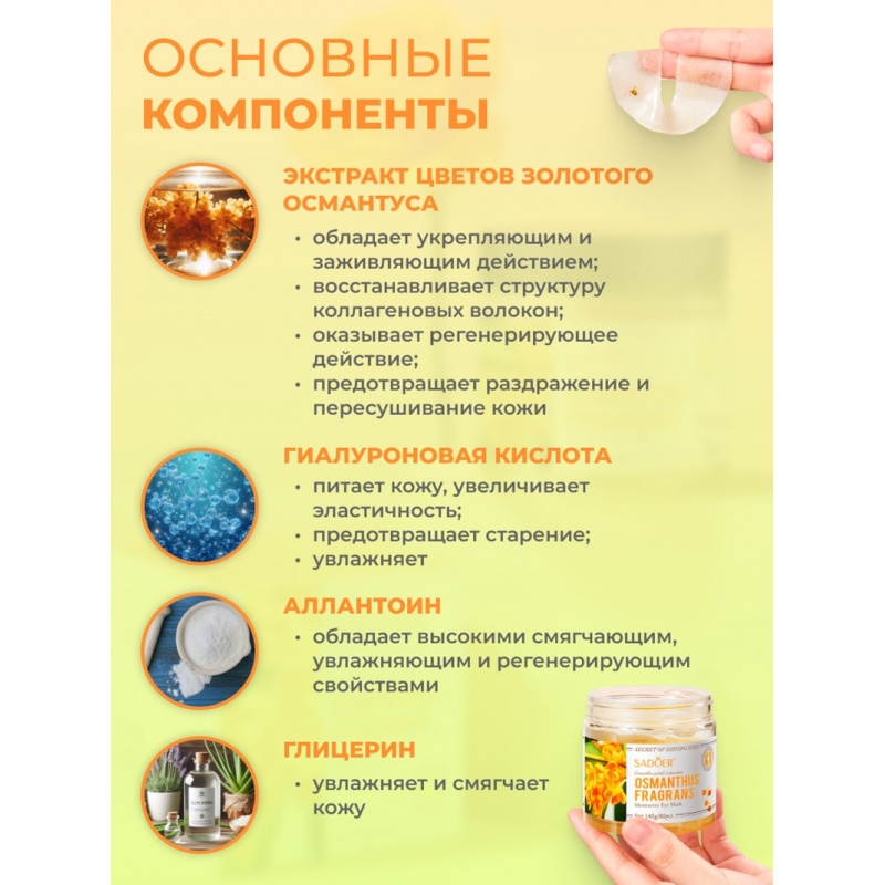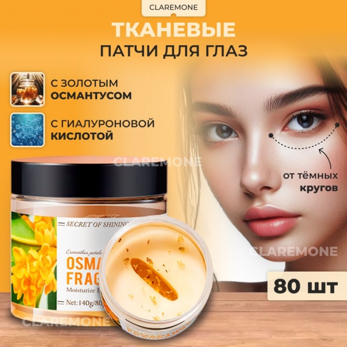 Тканевые патчи для глаз увлажняют кожу вокруг глаз, предупреждают преждевременное старение. Масло османтуса оказывает благотворное влияние на кожу, питает ее на клеточном уровне. Входящие в маску компоненты интенсивно борются с мелкими морщинами, устраняют мешки под глазами. Витамины и минералы восстанавливают красоту, возвращают здоровый вид кожи, придают лицу свежесть и молодость. Тканевые патчи для глаз идеально подходят для зрелой, а также поврежденной и чувствительной кожи. Патчи большие по размеру, их можно использовать не только под глаза, но и для разных зон лица: лба, носогубных и межбровных складок, губ, носа, шеи и подбородка. Для удобства тканевые патчи можно разрезать пополам. Для дополнительного тонизирующего и охлаждающего эффекта храните упаковку в холодильнике и доставайте перед использованием. Так утренние отеки и темные круги под глазами будут проходить еще быстрее. Тканевые патчи для глаз подходят для женщин всех возрастов, в том числе для юных девушек и подростков. Даже мужчины часто ими пользуются, потому что это очень просто, занимает мало времени, а эффект виден сразу. Способ применения 1) Извлеките патчи для глаз пинцетом из баночки. При необходимости разрежьте патчи поперёк, на две части. 2) Приложите патчи к коже вокруг глаз или под глазами. Через 15-20 минут удалите с кожи. 3) Остатки эссенции не смывайте, мягко вотрите в кожу. Рекомендуется регулярное применение. Комментарии к товару