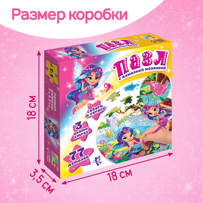 Габариты: 19 x 18,5 x 3,5 Страна: Китай В боксе: 70 набор Состав: Картон, пластик, бумага самоклеящаяся Материалы: картон, пластик, бумага самоклеящаяся Фасовка: по 1 набор Индивидуальная упаковка: Цветная картонная коробка Сертификат: ЕАС Для кого: Для девочки Ширина, см: 22 Высота, см: 22 Возраст: От 3 лет В наборе, шт.: 6 Длина собранного пазла, см: 22 Ширина собранного пазла, см: 22 Количество элементов: 77 Тематика: Детская Вид упаковки: Коробка картонная Тематика праздника: Универсальная тематика, 8 Марта Адресат: Без адресата Материал: Картон, Пластик Ориентация изображения: Квадрат Развитие навыков: Моторика, Мышление, Внимание Тип выкладки: С частичным заполнением Составляющие набора: Пазлы, Инструкция, Стразы Форма страз: Круглые Тип основы: Пазл Возраст: Для детей Тип пазлов: Классические Форма: Круг Особенности: С алмазной мозаикой Фиксированная цена: Да Пазл «Лесные феи» с элементами алмазной мозаики станет увлекательным развлечением для девочек от 3 лет. Собирая круглый пазл из 77 деталей, ребёнок погрузится в волшебный мир сказочных феечек, развивая при этом моторику, логику и творческое мышление. Особенности