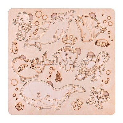 Код: 449650 Штрихкод: 4607155197461 Страна производитель: Россия Размеры упаковки: 25 x 25 x 0.5 см Количество в коробке: 20 Размер пазла: 25*25 см Пазл имеет форму морских жителей Фигурки морских жителей вырезаны отдельно Деталей: 8 шт Материал: дерево Для детей от 3-х лет Комментарии к товару